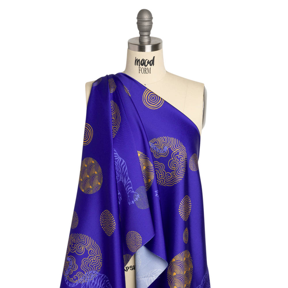 Our Mood Exclusive Blue Last Known Survivor Recycled Polyester Twill stalks his prey in the night! Stare into the eye of the tiger; light blue tigers lurk through a navy ground, illuminated by golden suns decorated with abstract doodles. This fabric is made of 100% recycled polyester (and 100% love for the environment!), featuring a smooth and lustrous face, similar to satin, and an airy drape. With a satisfying swish, move through both formal and informal gatherings in a-line dresses, skorts, maxi skirts, handkerchief tops, and so much more! Please note that a lining may be desired since it is slightly transparent.