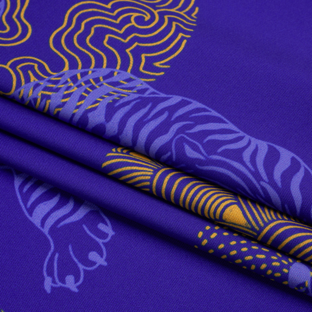 Our Mood Exclusive Blue Last Known Survivor Recycled Polyester Twill stalks his prey in the night! Stare into the eye of the tiger; light blue tigers lurk through a navy ground, illuminated by golden suns decorated with abstract doodles.