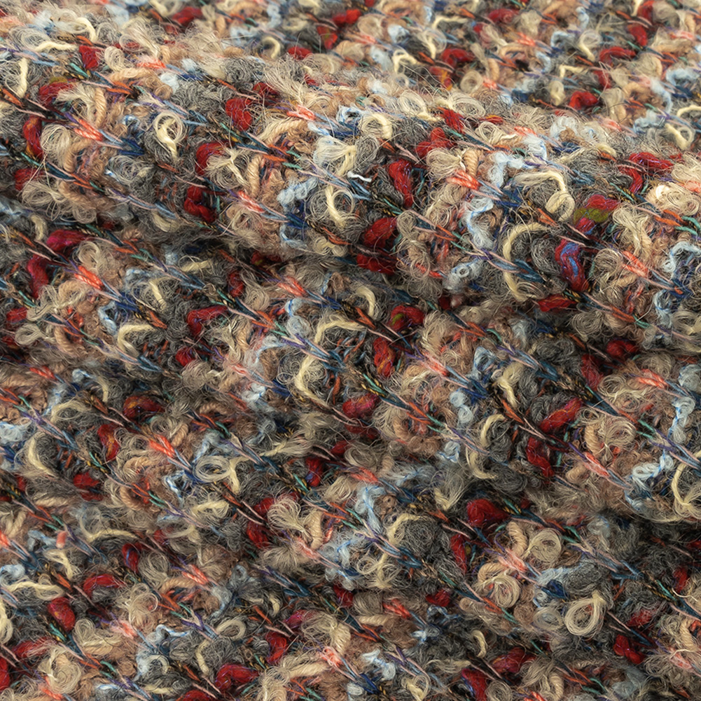 Don’t compromise on sparkle for warmth with our Red, Coral and Gray Striped Boucle Wool Knit featuring Clear Baby Sequins! Tiny clear sequins dazzle on a knitted ground of chunky fibers, all in varying textures and shades of red, coral, baby blue, and rail gray.