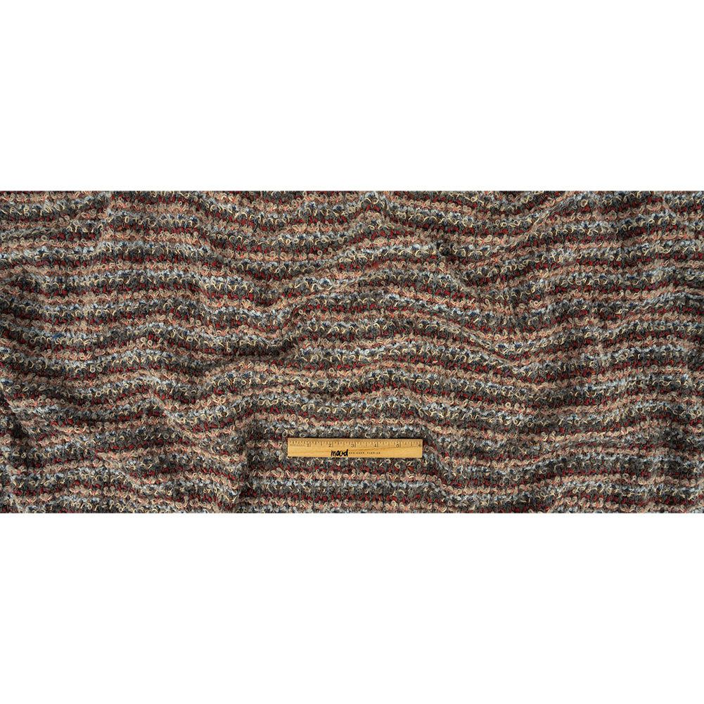 Don't compromise on sparkle for warmth with our Red, Coral and Gray Striped Boucle Wool Knit featuring Clear Baby Sequins! Tiny clear sequins dazzle on a knitted ground of chunky fibers, all in varying textures and shades of red, coral, baby blue, and rail gray. With a small amount of give throughout, use the pliable drape for tactile sweaters and sweater dresses, or bohemian capes and coats. Totally opaque, a lining is not required for opacity purposes but could be inserted for additional structure or comfortability.
