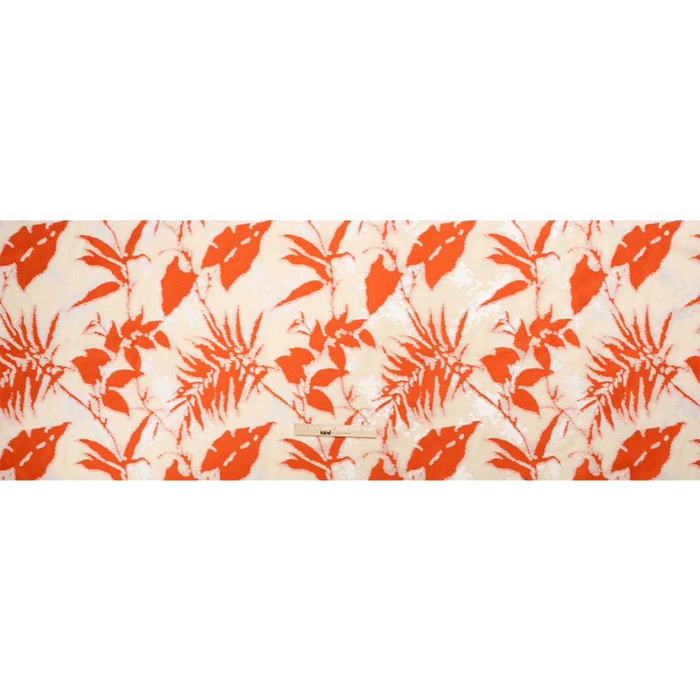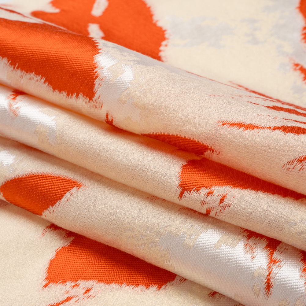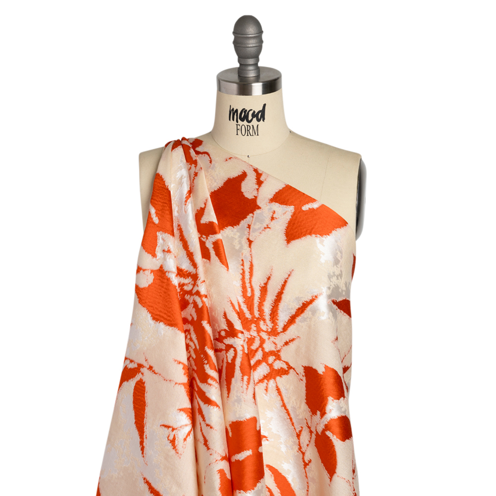 Natural images softly come into focus on this Red, White and Beige Soft Leaves Lightweight Polyester and Viscose Luxury Brocade. Abstract reddish-orange leaves and branches peek through a pale beige sky as lustrous white lines crisscross in the background. The colored sections bring dimension and a sleek texture to the slightly grainy and cool hand. This lightweight brocade falls with an easy drape, conjuring images of semi-structured silhouettes and long, flowing garments. Create structured blazers, handkerchief skirts, perfectly tailored gowns, and more! As this fabric is slightly translucent, we suggest lining it with our silk habotai linings for added opacity and luxury!