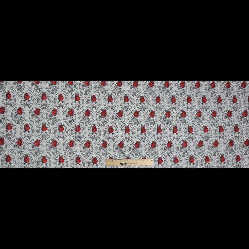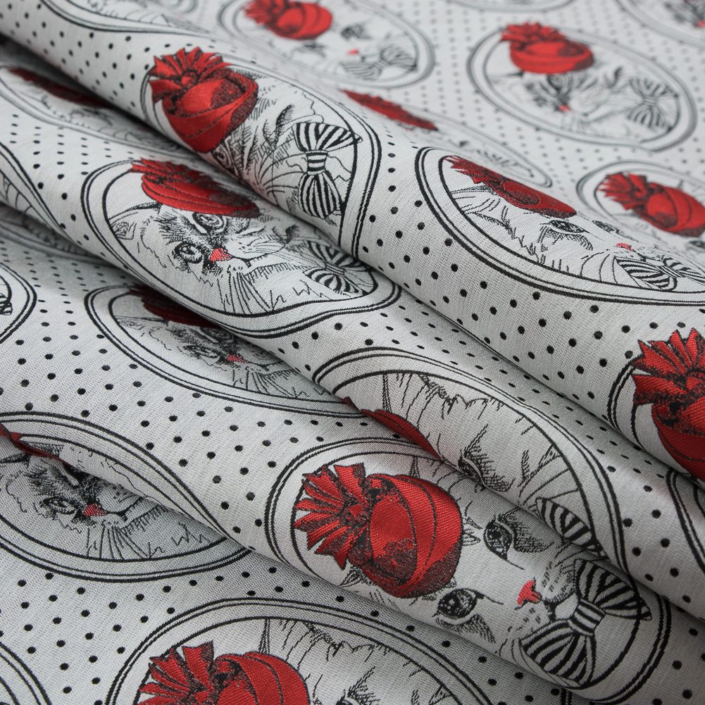 Your next piece will be the cat's meow when you add this Red, White and Black Cat with Top Hat Jacquard to your collection. Comprised of a matte finish with luminous red accents, this am-meow-sing material is an office favorite. A crisp and lightly textured hand, in conjunction with its well-structured drape yield for a purr-fect fabric choice when creating a charming handbag, an adorable bomber, or accent panels on a garment! Its varying translucence in structure denotes that a lining isn't completely necessary, but may be needed in the case of a more structure-intensive garment, or those that call for additional modesty.