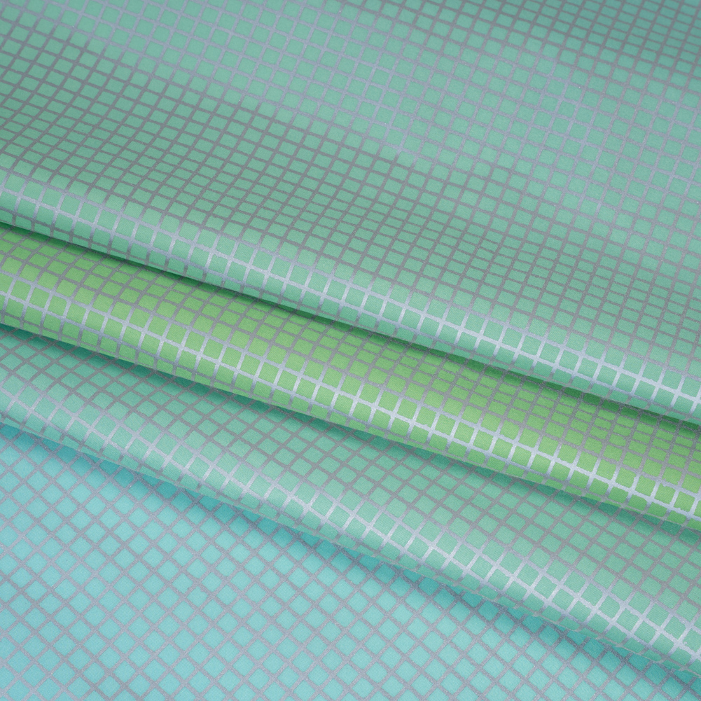 Reflective Print Fabric – Sky Blue and Lime Green Ombre with Silver Gray Grid