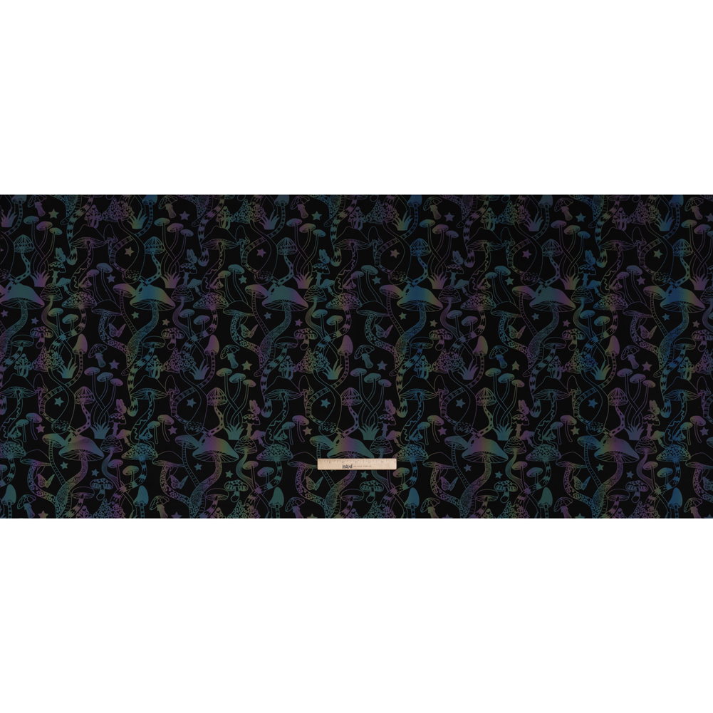Reflective Print Spandex Knit with 4-Way Stretch - Rainbow and Black Mushrooms