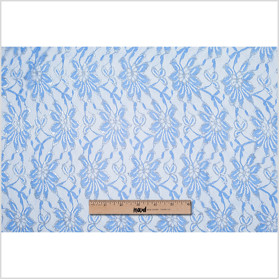 An attention-getting mesh lace in regatta blue with silver metallic highlights. Very lightweight and sheer, perfect as an overlayer fabric.