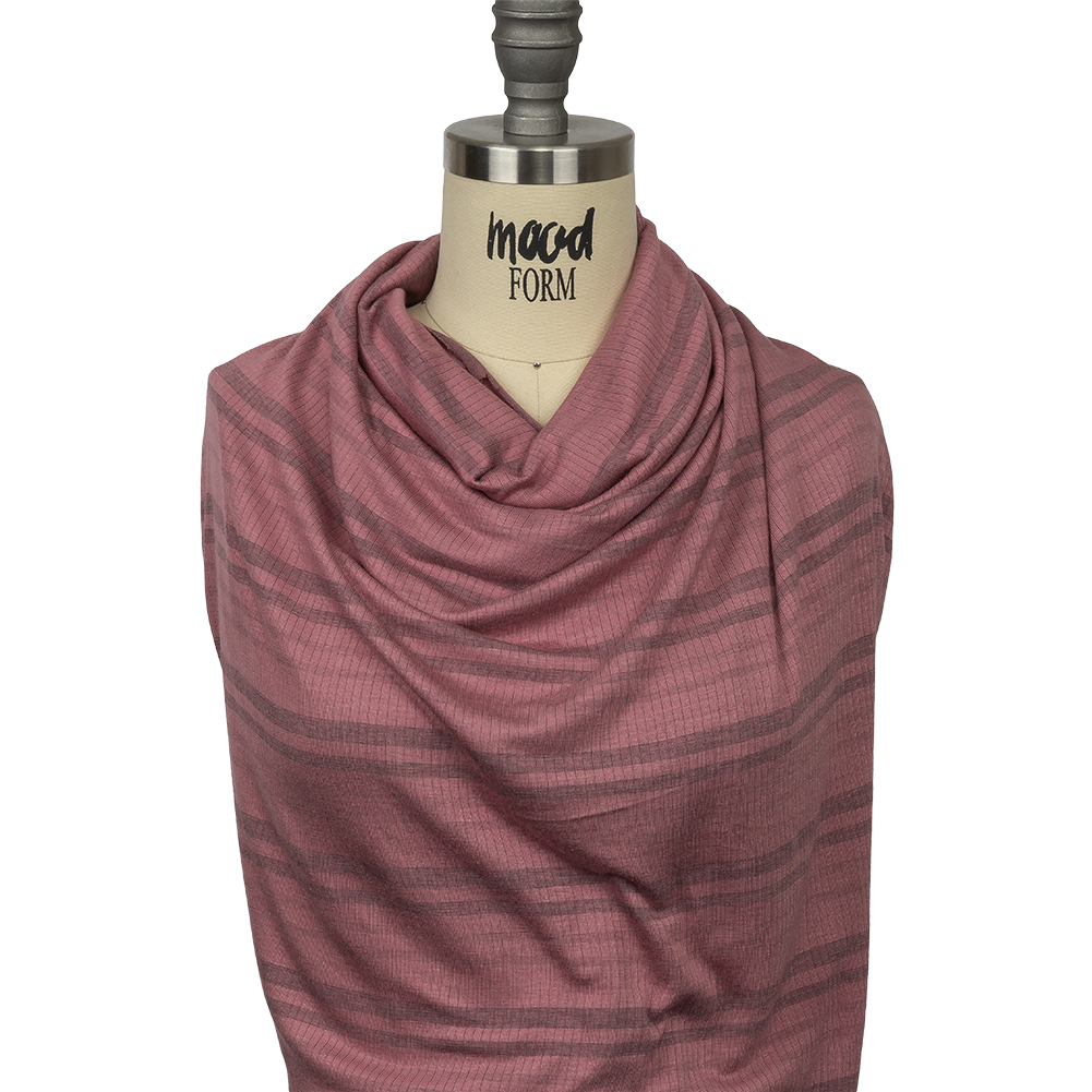 Life is perfectly rosy, especially when draped in this Rose and Charcoal Striped Stretch Rayon Rib Knit. Featuring a dull reddish pink base with subtle charcoal stripes, the ribbed pattern adds a subtle texture and a generous 75% widthwise stretch, exceeding the amount of stretch present along the lengthwise grain. With a supple drape, design oversized cardigans, hooded sweaters, tunics, tanks, and more. Though somewhat translucent, a lining is not necessary for most applications.