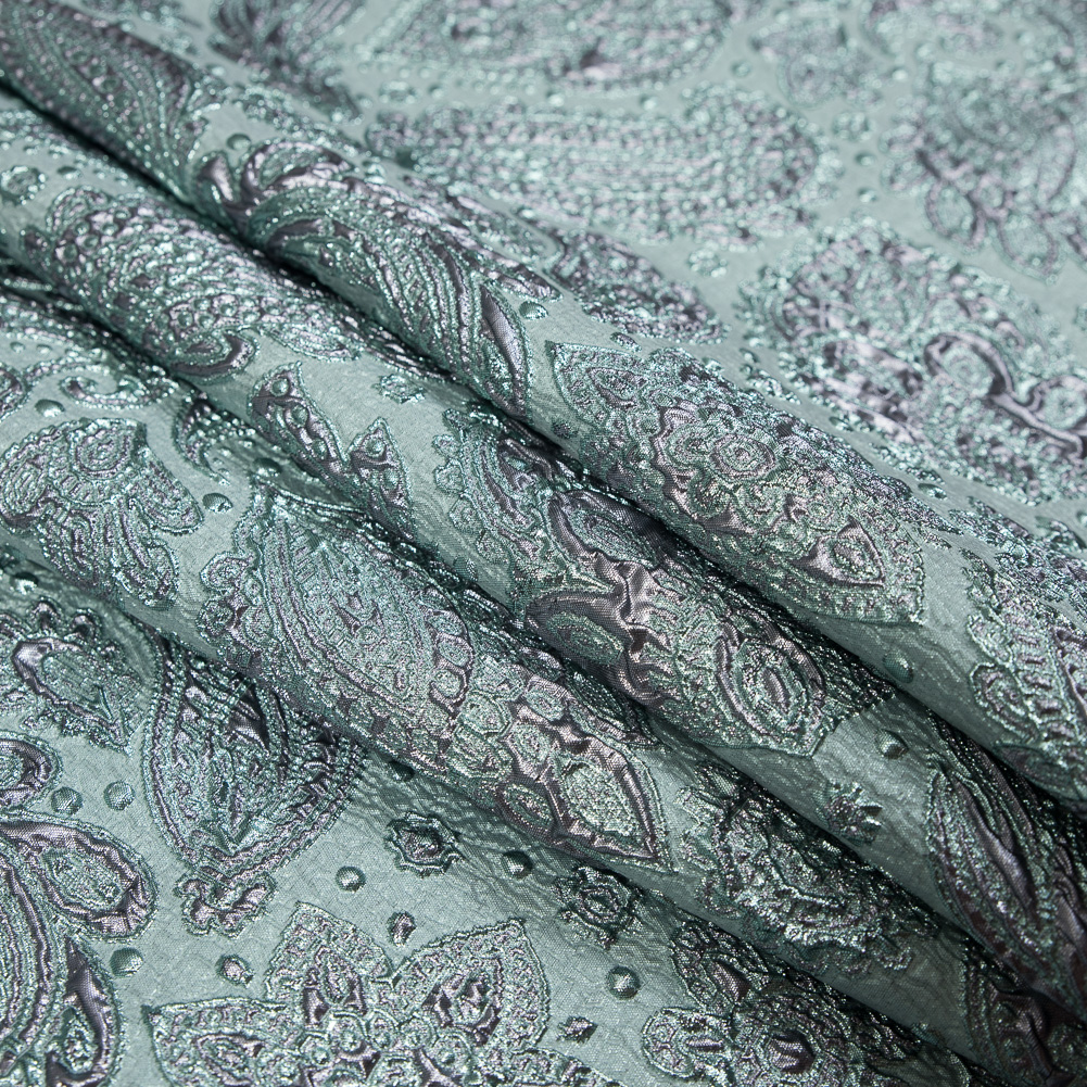 Presenting our Rose Gold and Seafoam Luxury Paisley Metallic Brocade. Ornate paisleys and flowers adorn a seafoam background, giving this fabric a lavish, gilded look. Combined with the fantastic two-tone coloration, the raised surface really allows the elaborate design of this metallic brocade to pop. Thin and lightweight, this fabric comes with a crisp hand and a billowy drape, making it a fantastic choice for your drop-dead gorgeous jackets, ball gowns, and more. Opaque, a lining may be added for comfort.