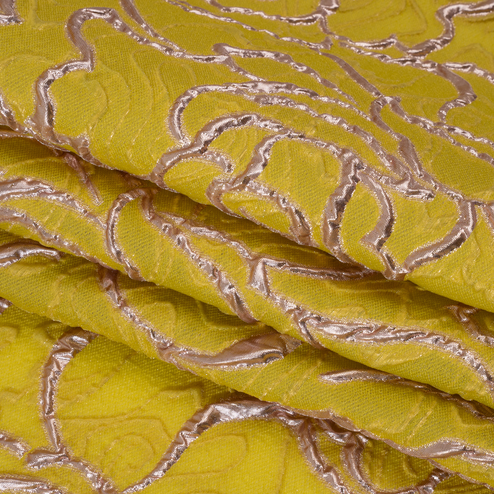 Get Gala-ready with this Metallic Gold and Sunshine Yellow Rose Outlined Cutwork Luxury Brocade. With a sheer face embossed with opaque rose outlines and a semi-structured drape, it’s perfect for glitzy nights out.Suggested Projects: Dresses, Tops, Skirts, AccessoriesContent: 50% Polyester, 30% Viscose, 20% LurexStretch: No StretchOpacity: SheerStrut past vying paparazzo while draped in this sheer luxury brocade. Embossed outlines of roses swirl across the otherwise sheer backdrop, creating a three-dimensional, tactile hand and falling in a semi-structured drape. This fabric is perfect as an overlay for an evening gown or skirt, or on its own for a Met Gala-esque avant-garde look. As this fabric is sheer, we recommend use with a lining, or over camis or slips.