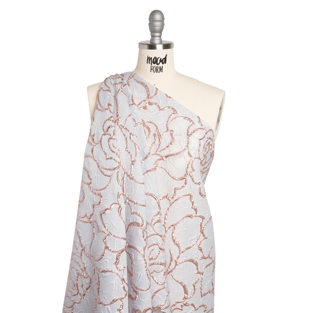 Get Gala-ready with this Metallic Rose Gold and Pale Blue Gray Rose Outlined Cutwork Luxury Brocade. With a sheer face embossed with opaque rose outlines and a semi-structured drape, it’s perfect for glitzy nights out.Suggested Projects: Dresses, Tops, Skirts, AccessoriesContent: 50% Polyester, 30% Viscose, 20% LurexStretch: No StretchOpacity: SheerStrut past vying paparazzo while draped in this sheer luxury brocade. Embossed outlines of roses swirl across the otherwise sheer backdrop, creating a three-dimensional, tactile hand and falling in a semi-structured drape. This fabric is perfect as an overlay for an evening gown or skirt, or on its own for a Met Gala-esque avant-garde look. As this fabric is sheer, we recommend use with a lining, or over camis or slips.