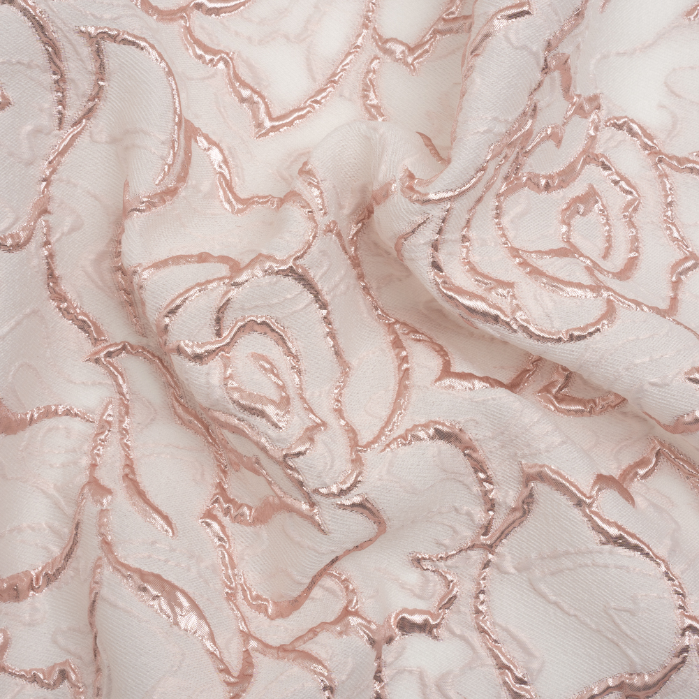 Get Gala-ready with this Metallic Rose Gold and Pale Pink Rose Outlined Cutwork Luxury Brocade. With a sheer face embossed with opaque rose outlines and a semi-structured drape, it’s perfect for glitzy nights out.Suggested Projects: Dresses, Tops, Skirts, AccessoriesContent: 50% Polyester, 30% Viscose, 20% LurexStretch: No StretchOpacity: SheerStrut past vying paparazzo while draped in this sheer luxury brocade. Embossed outlines of roses swirl across the otherwise sheer backdrop, creating a three-dimensional, tactile hand and falling in a semi-structured drape. This fabric is perfect as an overlay for an evening gown or skirt, or on its own for a Met Gala-esque avant-garde look. As this fabric is sheer, we recommend use with a lining, or over camis or slips.