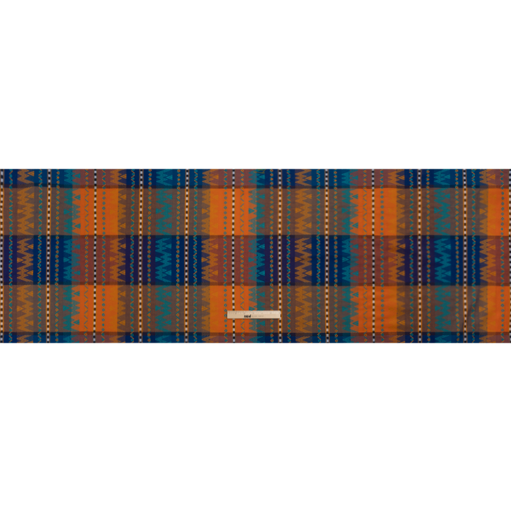 Dare to defy the ordinary with this Royal, Orange and Teal Geometric Stripes Cotton and Rayon Jacquard! A Jacquard weave pushes vertical geometric stripes from the checkered background, creating a uniquely gridded face with textural dimension.