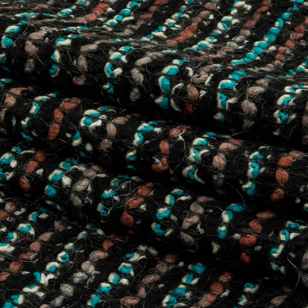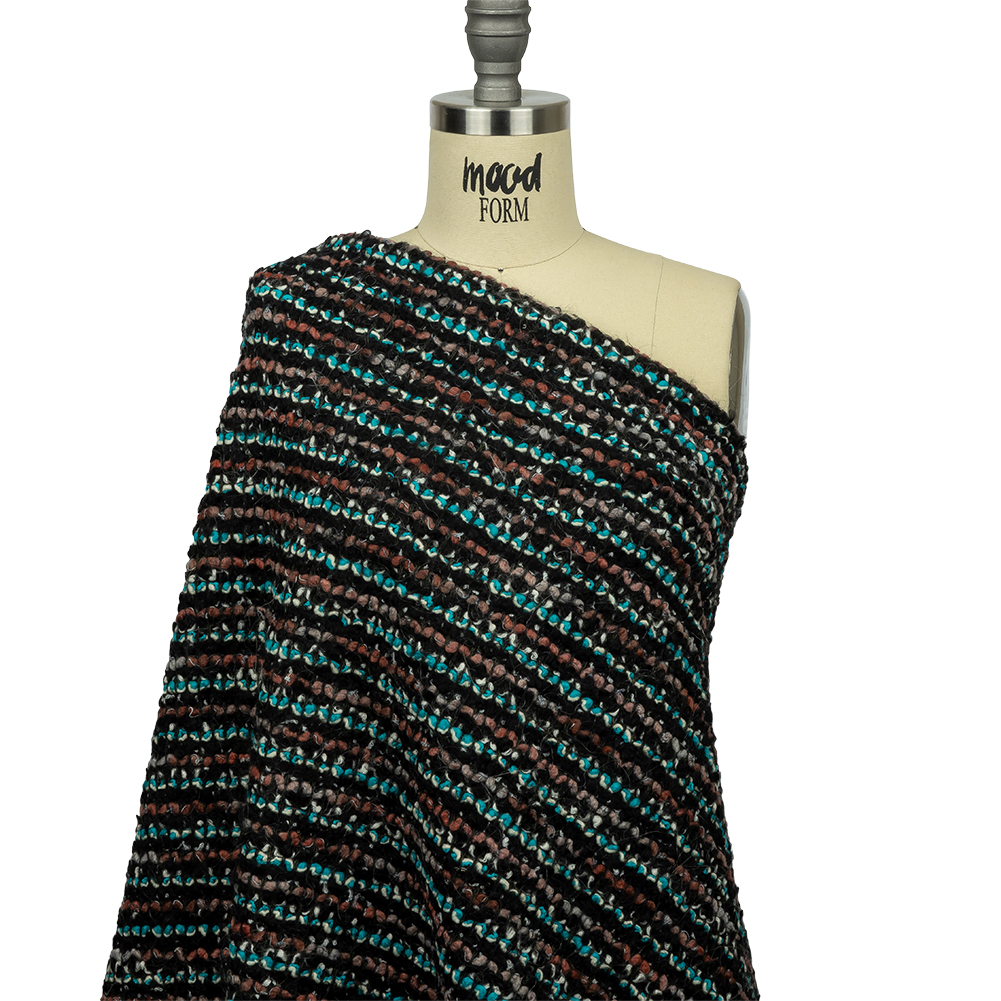 Take advantage of sweater weather with this Russet, Turquoise, and Black Boucle Stripes Chunky Wool Blend Sweater Knit.