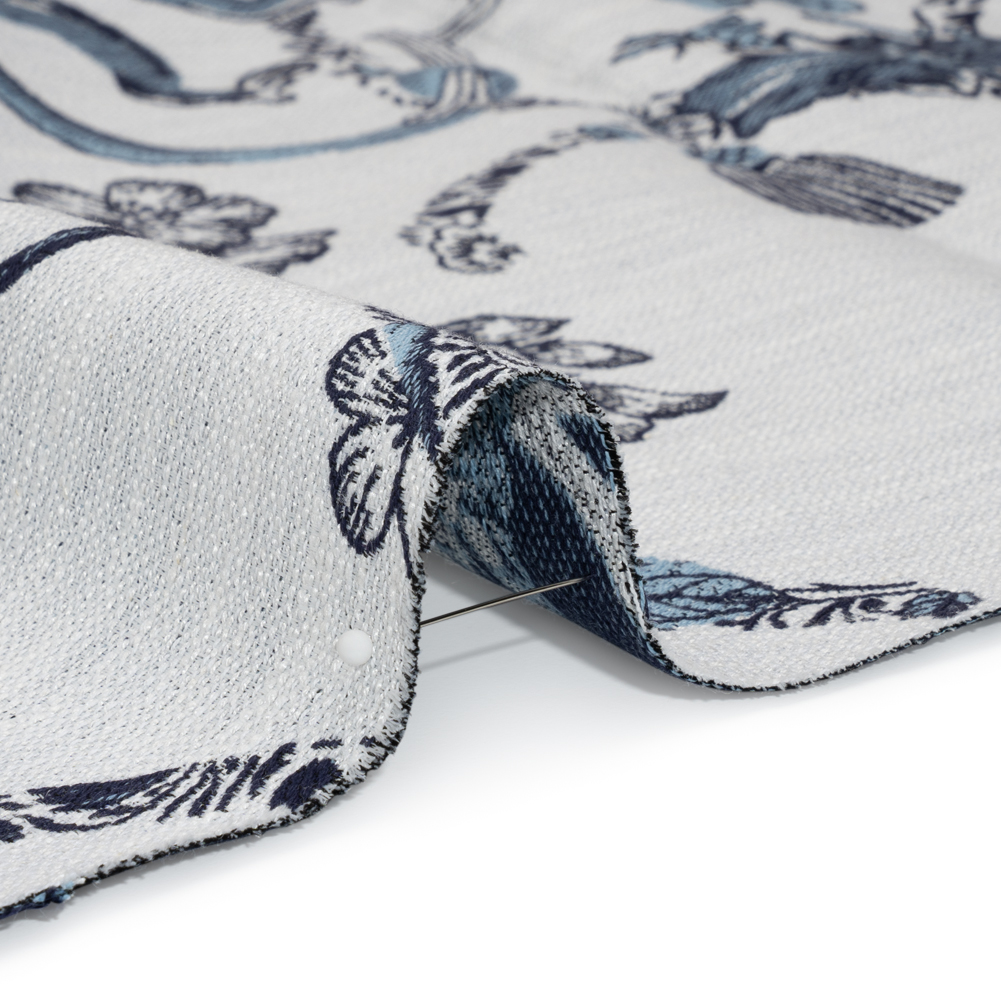 Tell a story with this Sapphire Exotic Pets and Flowers Upholstery Jacquard. The unbothered sultan and his busy advisor let us into their royal society of branches, bees, and blossoms, colored navy and light blue under a white sky. A Jacquard loom is to thank for the embroidered-like texture, complimenting the air of sophistication already established by the pattern. It features a sleek yet pebbly hand and a malleable drape. A slight luster is the final touch of luxury, solidifying this fabric's place in formal dining rooms, elevated living rooms, and mature bedrooms—we imagine ornate couches, reupholstered vintage chaises, bar stool covers, and more.