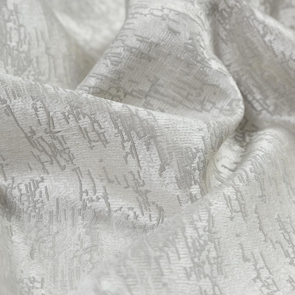 Let this British Imported Dove Satin-Faced Crackle Jacquard add space to your room as it shimmers and shines. Inspired by the great outdoors, the luminous woven presents a tactile look similar to a tree's bark. Thin with a heavy weight, use it to upholster couches, lounge chairs, ottomans and more! It presents a lovely drape, so create full curtains and other drapery applications with this stunning jacquard too. Slightly translucent, it lets just enough light in. No matter what you choose to do with this woven, it is sure to tie your room together.