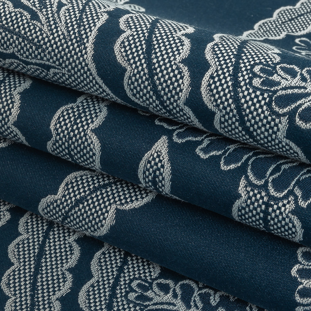Leaf no room's decor behind with this British Imported Ink Foliage Satin-Faced Jacquard! On a luminous deep blue satin ground, a lush variety of leaves spread and sway in darker blue and light cool gray, most filled with a small checkerboard pattern, while the Jacquard weave lends a textural hand. A malleable yet voluminous drape makes an ideal material for statement curtains: bold drapes over light, airy sheers or blinds, heavy shades with fringe trims, or colorful curtains to compliment an accent wall. Plus lighter-use upholstery projects like headboards and throw pillows will shine, too! Generally opaque, a lining is recommended for full blackout effect where desired, as well as to protect against sun fading in high-sun areas.Note: This fabric, in particular, can be machine washed up to temperatures of 30 degrees Celsius. Do not bleach or tumble dry this material. This fabric can be dry cleaned with any solvent except tetrachlorethylene.