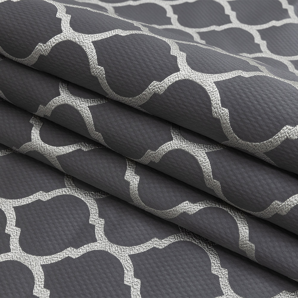 The deep purple-gray tones of this British Imported Iris Moroccan Quatrefoil Satin-Faced Jacquard are a sweet dream come true. An intricate lattice pattern rises over a shimmering ground with a subtle waffle texture. A sumptuous collection of textures with a voluminous drape makes a fabric that's ideal for adding a lux touch to your home decor. Create stately drapes, regal curtains, and swags and valances that would make anyone jealous. While this material is excellent at blocking light on its own, adding a drapery lining can only help; plus, it will protect the fibers from sun damage and fading.
