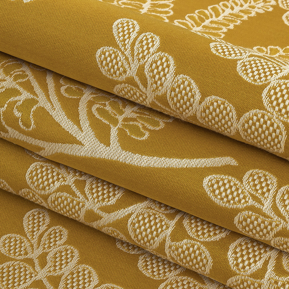 This sunny British Imported Mimosa Foliage Satin-Faced Jacquard just screams summer! On a luminous golden yellow satin ground, a lush variety of leaves spread and sway in darker yellow and light warm gray, most filled with a small checkerboard pattern, while the Jacquard weave lends a textural hand. A malleable yet voluminous drape makes an ideal material for statement curtains: bold drapes over light, airy sheers or blinds, heavy shades with fringe trims, or colorful curtains to compliment an accent wall. Plus lighter-use upholstery projects like headboards and throw pillows will shine, too! Generally opaque, a lining is recommended for full blackout effect where desired, as well as to protect against sun fading in high-sun areas.Note: This fabric, in particular, can be machine washed up to temperatures of 30 degrees Celsius. Do not bleach or tumble dry this material. This fabric can be dry cleaned with any solvent except tetrachlorethylene.