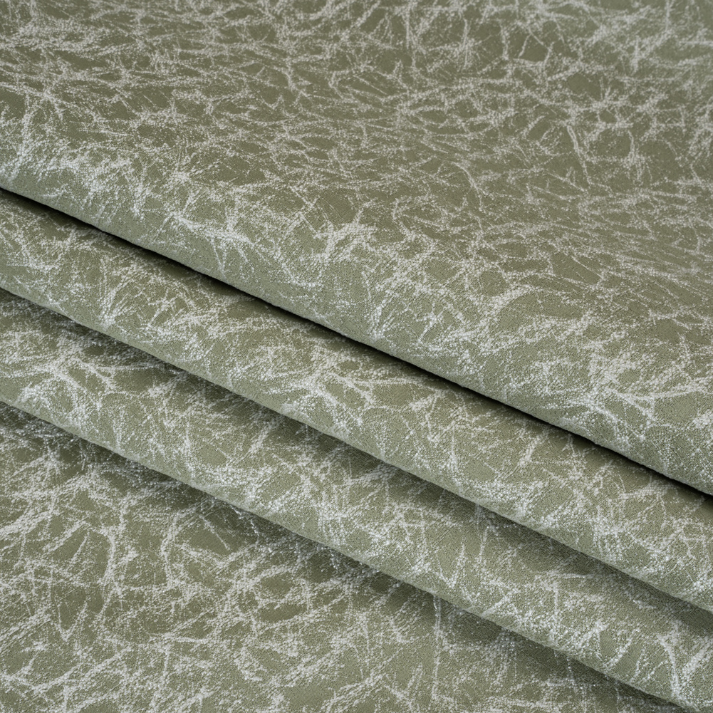 Clear bad energy from your room with this Sage Cracked Satin-Faced Jacquard. With a soft, tactile hand and voluminous drape, take a crack at using this fabric for your next home project.Suggested Projects: Drapes, Curtains, Table Runners, Light UpholsteryContent: 83% Recycled Polyester, 17% PolyesterStretch: NoneOpacity: Slightly TranslucentThe first task on your self-care list is using this sage green jacquard. The embroidered cracked design featured on this jacquard creates a wrinkled, distressed look adding both texture and dimension to your space. Its satin-like, sage green face is matched with a luminous white letting its pattern pop. Thin with a medium weight, its versatility can take it from curtains to light upholstery to table runners! Play with both texture and pattern within your design theme and pair this lovely jacquard with a velvet for a modern look. Note that it is slightly translucent.