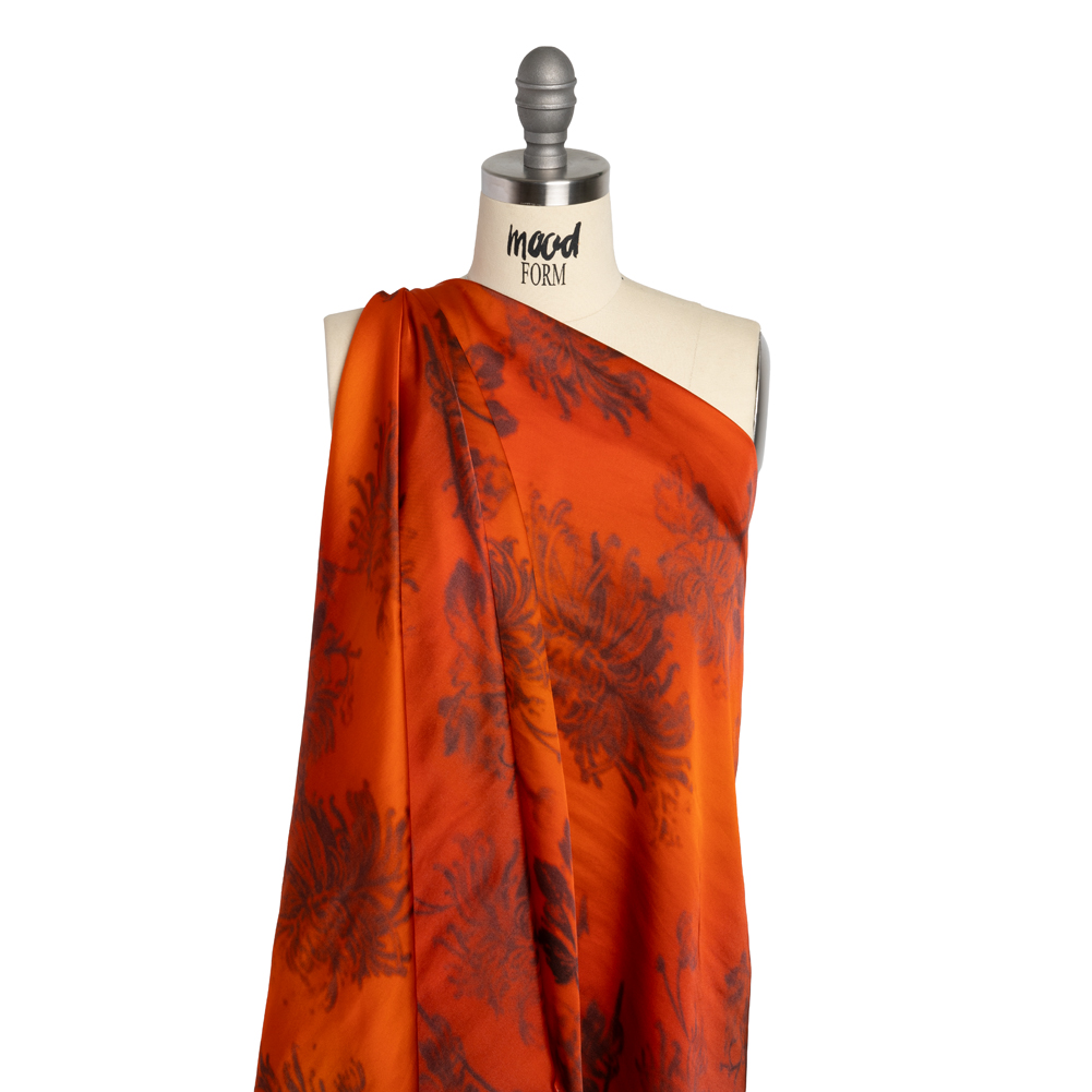 Even under a blazing sun, flowers bloom across this Hazy Florals Satin-Faced Rayon Twill. Made in Italy, it features a smooth face and fluid drape.Suggested Projects: Blouses, Dresses, Skirts, LiningsContent: RayonStretch: NoneOpacity: Mostly OpaqueThrough a fiery orange haze, black shadows and outlines of spider lilies stand out to the eye. The smooth face boasts a luster—thanks to a satin-face—and drapes in fluid waves across your projects. Use this satin to create flowing flute-sleeve dresses, maxi skirts, blouses, and more. Mostly opaque, a lining is not necessary but can be added for total opacity.