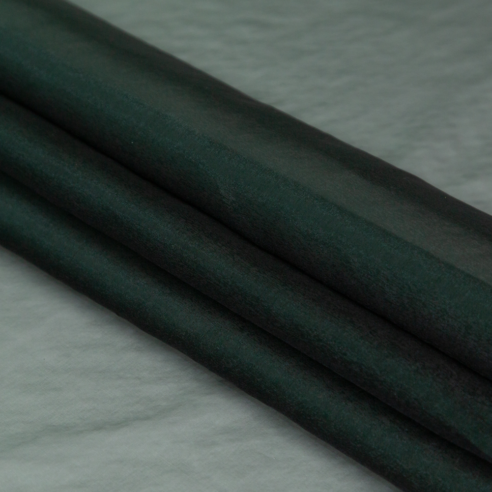 There are organza fabrics that will simply do, and then there's this immaculate Shimmering Emerald and Black Iridescent Organza. Featuring a luminous, completely sheer organza base made of shimmering black and emerald threads woven together, this fabric is the perfect choice for adding a sophisticated luster to your drop-dead gorgeous eveningwear. Thin and lightweight, it comes with a crisp, airy hand and a voluminous drape. It is ideal for evening gowns, as well as couture skirts, tops, and more—the possibilities are simply endless! A lining may be desired depending on the application.