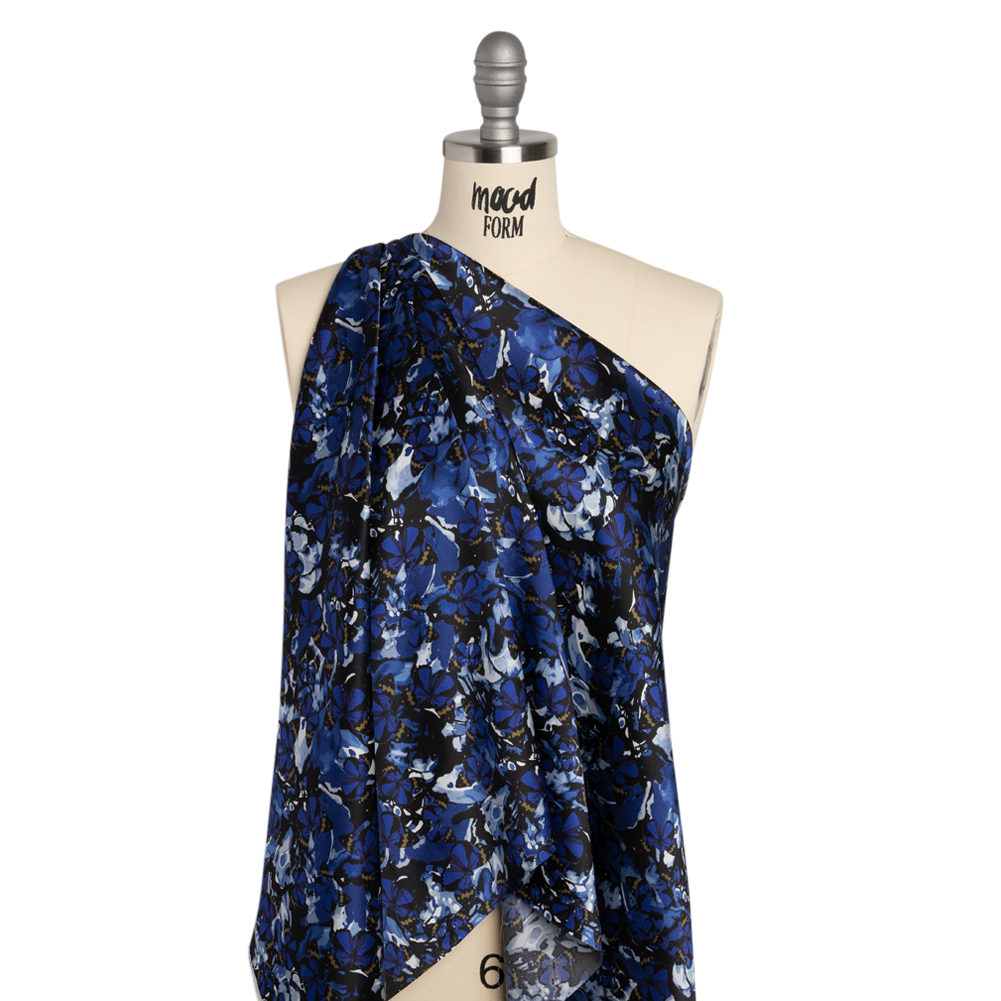 A storm of inspiration descends upon you with this Navy Blue, Black and Gold Little Butterflies and Flowers 19mm Silk Charmeuse. With a subtle luster, it features a fluid drape and silky smooth hand that you won’t want to let go of.Suggested Projects: Dresses, Skirts, Lingerie, BlousesContent: 100% SilkStretch: NoneOpacity: TranslucentA kaleidoscope of navy blue and gold butterflies flutters against a busy navy blue, black, and dusty blue floral background. Fluid and lightweight, this silk charmeuse is of the highest quality, with a smooth, slippery feel adding to its luxurious look. Create slip dresses and bias-cut evening gowns, dreamy lingerie, or effortless dusters. Translucent, particularly in the lighter-colored areas, a lining may be added to increase opacity and structure but isn't of necessity.