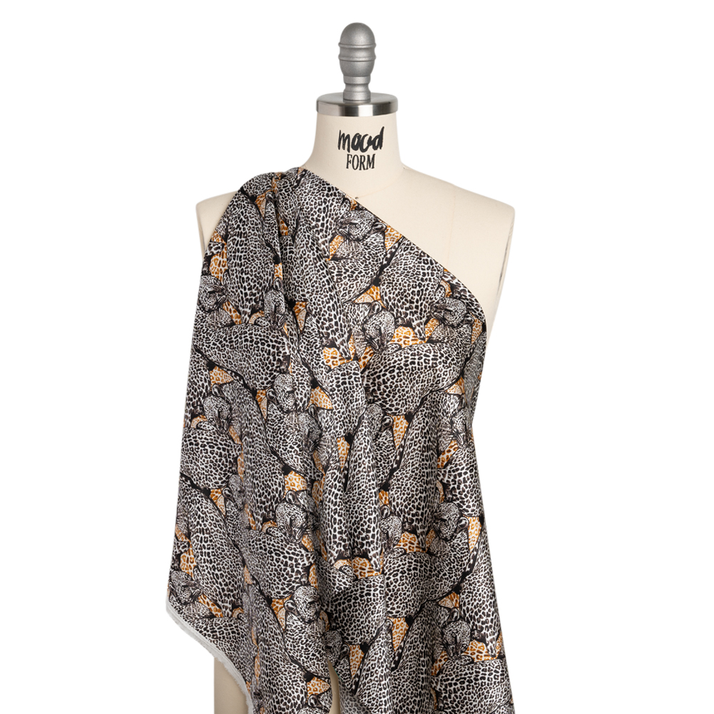 Create truly endangered pieces with this Snow Leopards 19mm Silk Charmeuse. With a subtle luster, it features a fluid drape and silky smooth hand that you won’t want to let go of.Suggested Projects: Dresses, Skirts, Lingerie, BlousesContent: 100% SilkStretch: NoneOpacity: TranslucentBlack, beige, and white snow leopards look back at you from within this charmeuse. Fluid and lightweight, this silk charmeuse is of the highest quality, with a smooth, slippery feel adding to its luxurious look. Create slip dresses and bias-cut evening gowns, dreamy lingerie, or effortless dusters. Translucent, particularly in the lighter-colored areas, a lining may be added to increase opacity and structure but isn't of necessity.