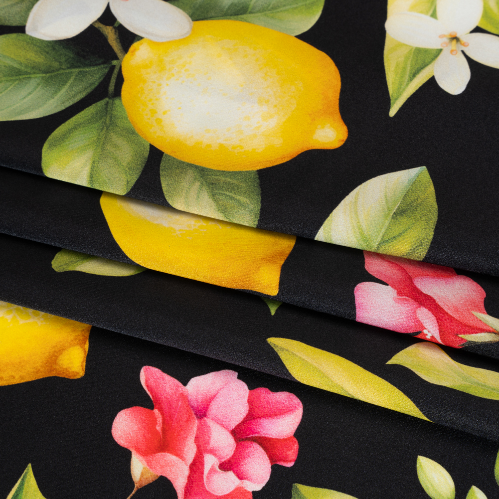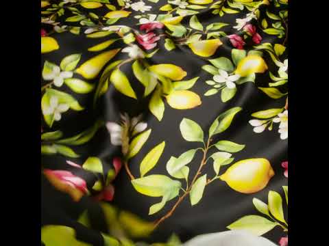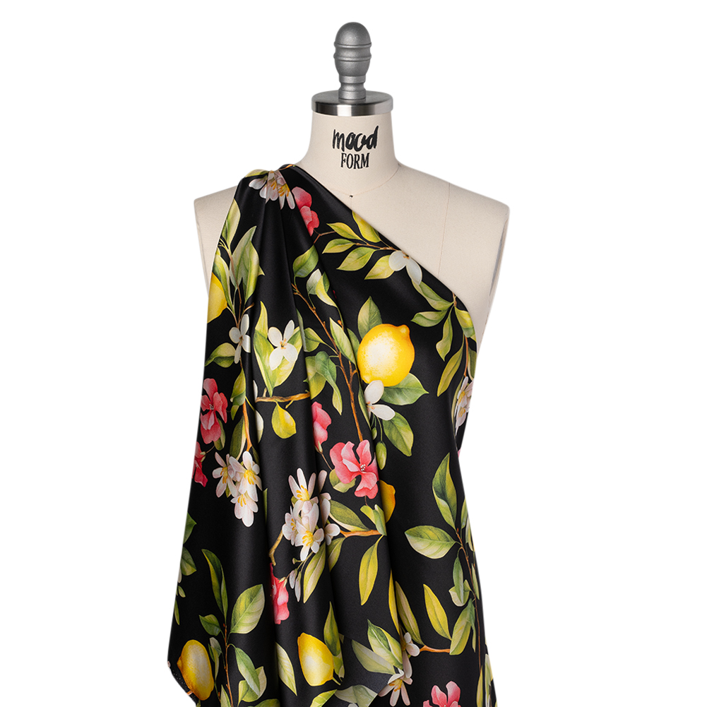 End your night sipping limoncello and draped in this Black Blossoming Lemon Tree Silk Charmeuse Print. Made in Italy, it boasts a subtle luster, fluid drape, and silky smooth hand.Suggested Projects: Dresses, Skirts, Pants, BlousesContent: 100% SilkStretch: NoneOpacity: Slightly TranslucentKeep a slice of your Sorrento summer year-round with this black charmeuse, where blooming lemon trees stretch across the surface in a sunny, Mediterranean-inspired print. Fluid and lightweight, this silk charmeuse is of the highest quality, with a smooth, slippery feel adding to its luxurious look. Create slip dresses and bias-cut evening gowns, loose and flowing pants, or breezy blouses. Slightly translucent, particularly in the lighter-colored areas, a lining may be added to increase opacity and structure but isn't of necessity.