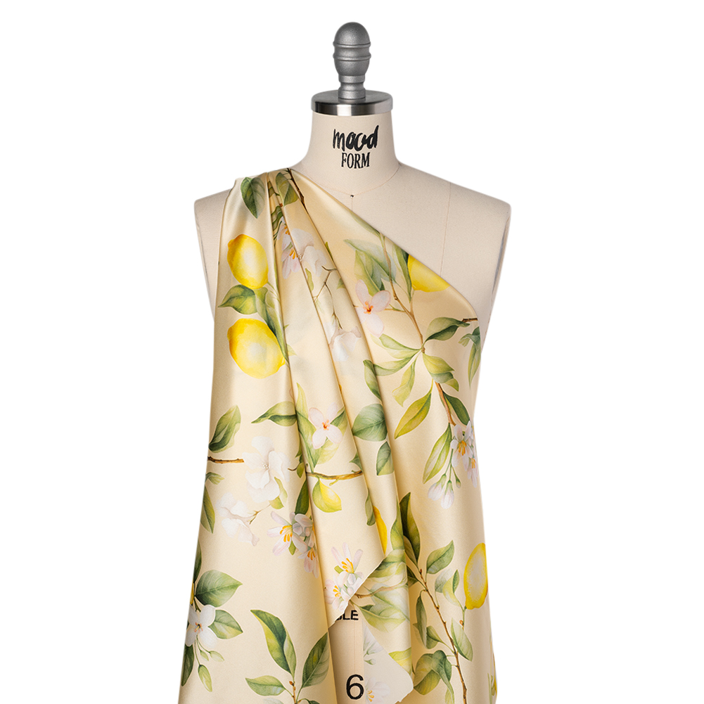Keep cool with a fresh lemon sorbet and this Cream Blossoming Lemon Tree Silk Charmeuse Print. Made in Italy, it boasts a subtle luster, fluid drape, and silky smooth hand.Suggested Projects: Dresses, Skirts, Pants, BlousesContent: 100% SilkStretch: NoneOpacity: Slightly TranslucentKeep a slice of your Sorrento summer year-round with this cream charmeuse, where blooming lemon trees stretch across the surface in a sunny, Mediterranean-inspired print. Fluid and lightweight, this silk charmeuse is of the highest quality, with a smooth, slippery feel adding to its luxurious look. Create slip dresses and bias-cut evening gowns, loose and flowing pants, or breezy blouses. Slightly translucent, particularly in the lighter-colored areas, a lining may be added to increase opacity and structure but isn't of necessity.