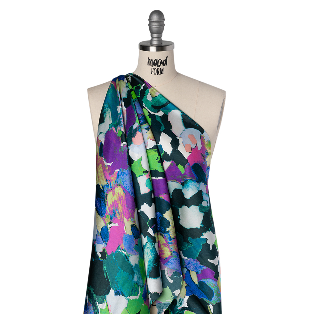 Bring your painted dreams to life with this Painterly Abstract Silk Charmeuse Print. Made in Italy, it boasts a subtle luster, fluid drape, and silky smooth hand.Suggested Projects: Dresses, Skirts, Pants, BlousesContent: 100% SilkStretch: NoneOpacity: Slightly TranslucentGaze into the abstract strokes of dark teal, lime green, purple, and blue paint that dance across this charmeuse—each streak a whisper of inspiration, waiting to become your next masterpiece. Fluid and lightweight, this silk charmeuse is of the highest quality, with a smooth, slippery feel adding to its luxurious look. Create slip dresses and bias-cut evening gowns, loose and flowing pants, or breezy blouses. Slightly translucent, particularly in the lighter-colored areas, a lining may be added to increase opacity and structure but isn't of necessity.