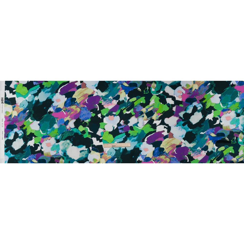 Silk Charmeuse Print 16MM, Made in Italy – Dark Teal, Lime Green and Purple Painterly Abstract