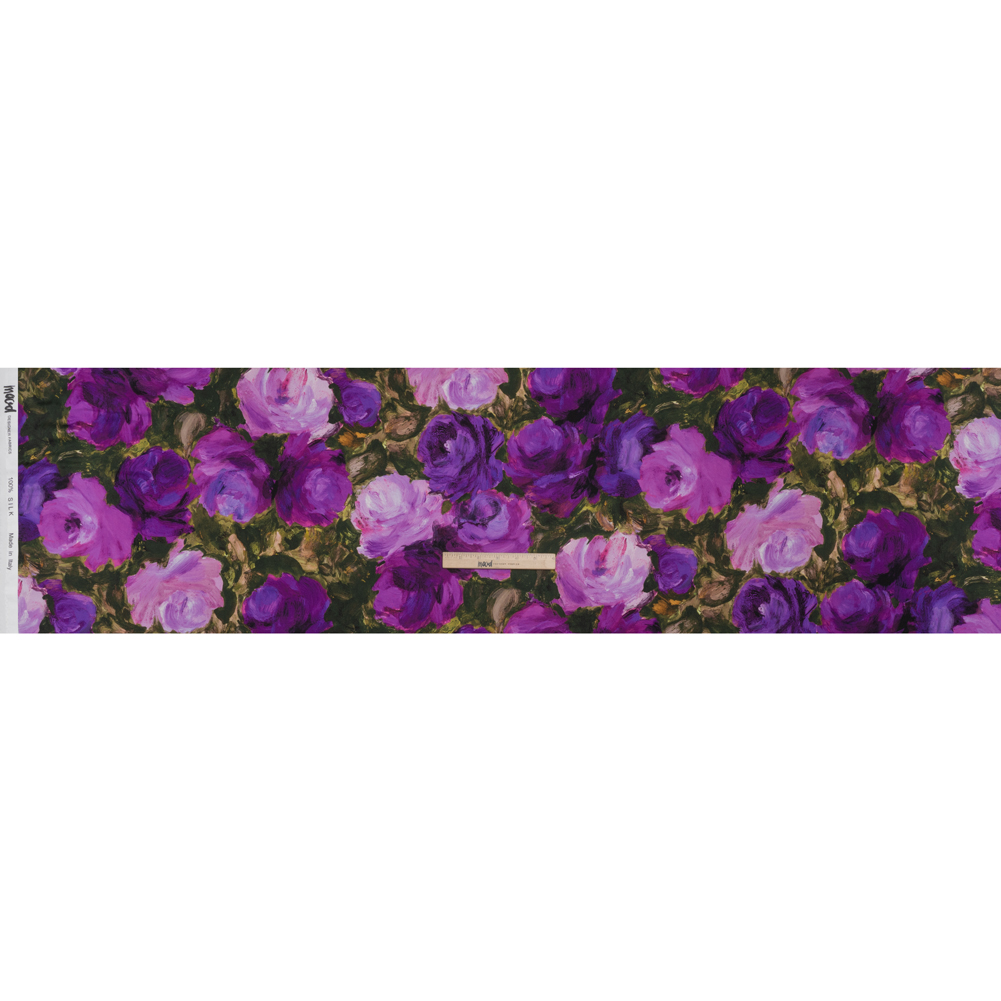 Silk Charmeuse Print 16MM, Made in Italy – Forest Green and Royal Purple Painted Roses