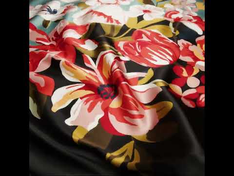 Think big when fashioning designs from this Big Floral Border Silk Charmeuse Print. Made in Italy, it boasts a subtle luster, fluid drape, and silky smooth hand.Suggested Projects: Dresses, Skirts, Pants, BlousesContent: 100% SilkStretch: NoneOpacity: Slightly TranslucentBig red, pink, and white flowers bloom alongside their green leaves, the border between a muted blue and black backdrop. Fluid and lightweight, this silk charmeuse is of the highest quality, with a smooth, slippery feel adding to its luxurious look. Create slip dresses and bias-cut evening gowns, loose and flowing pants, or breezy blouses. Slightly translucent, particularly in the lighter-colored areas, a lining may be added to increase opacity and structure but isn't of necessity.