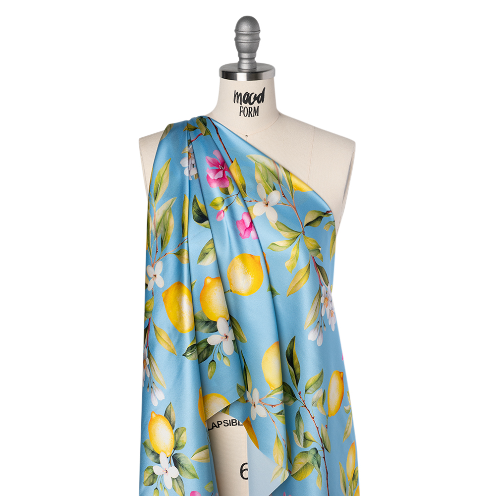 Take in the blue sky and salty sea air while sailing the Amalfi Coast in this Sky Blue Blossoming Lemon Tree Silk Charmeuse Print. Made in Italy, it boasts a subtle luster, fluid drape, and silky smooth hand.Suggested Projects: Dresses, Skirts, Pants, BlousesContent: 100% SilkStretch: NoneOpacity: Slightly TranslucentKeep a slice of your Sorrento summer year-round with this sky blue charmeuse, where blooming lemon trees stretch across the surface in a sunny, Mediterranean-inspired print. Fluid and lightweight, this silk charmeuse is of the highest quality, with a smooth, slippery feel adding to its luxurious look. Create slip dresses and bias-cut evening gowns, loose and flowing pants, or breezy blouses. Slightly translucent, particularly in the lighter-colored areas, a lining may be added to increase opacity and structure but isn't of necessity.