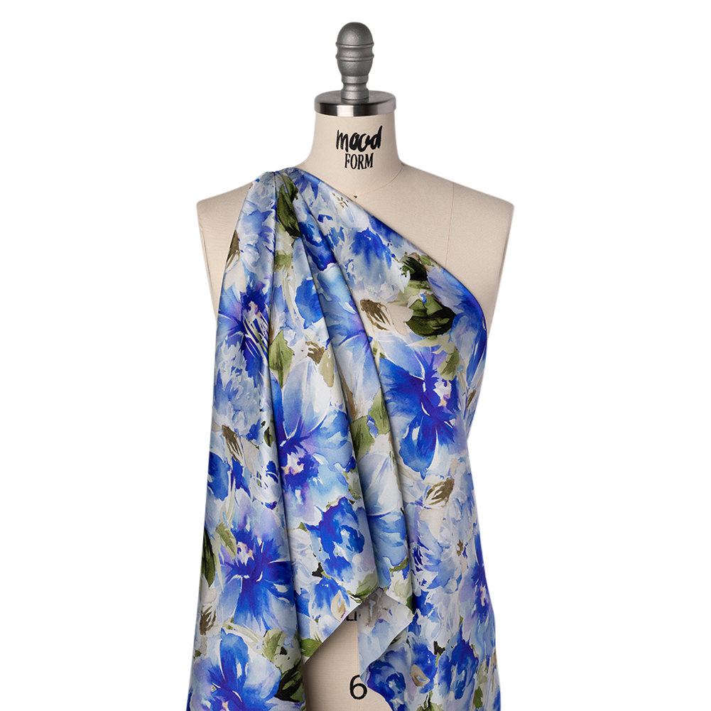 Feel inspiration flow through you atop this Ultramarine Blue Watercolor Flower Garden Silk Charmeuse Print. Made in Italy, it boasts a subtle luster, fluid drape, and silky smooth hand.Suggested Projects: Dresses, Skirts, Pants, BlousesContent: 100% SilkStretch: NoneOpacity: Slightly TranslucentWater you waiting for? Let this painterly watercolor garden sweep you away in strokes of ultramarine blue, olive green, and soft beige. Fluid and lightweight, this silk charmeuse is of the highest quality, with a smooth, slippery feel adding to its luxurious look. Create slip dresses and bias-cut evening gowns, loose and flowing pants, or breezy blouses. Slightly translucent, particularly in the lighter-colored areas, a lining may be added to increase opacity and structure but isn't of necessity.