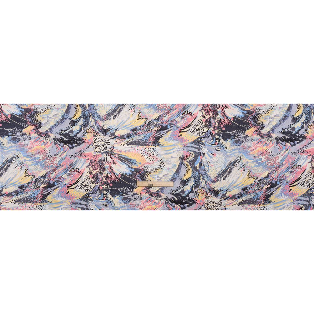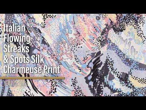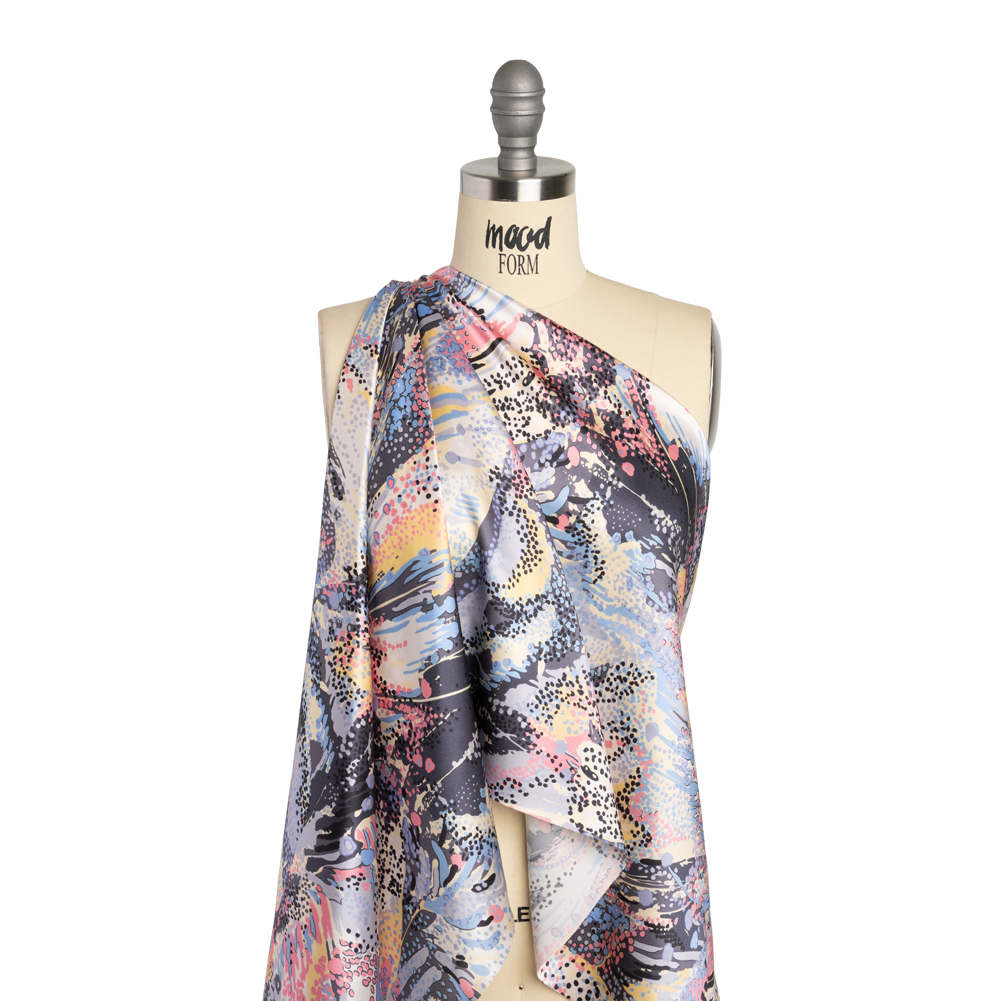Expressionist yourself with this Flowing Streaks and Spots Silk Charmeuse Print. With a subtle luster, it features a fluid drape and silky smooth hand.Suggested Projects: Dresses, Skirts, Lingerie, BlousesContent: 100% SilkStretch: NoneOpacity: TranslucentPink, butter yellow, sky blue, lavender, and gray streak and spot across this charmeuse—creating a splatter-paint-like effect, reminiscent of Jackson Pollock. Fluid and lightweight, this silk charmeuse is of the highest quality, with a smooth, slippery feel adding to its luxurious look. Create slip dresses and bias-cut evening gowns, dreamy lingerie, or effortless dusters. Translucent, particularly in the lighter-colored areas, a lining may be added to increase opacity and structure but isn't necessary.