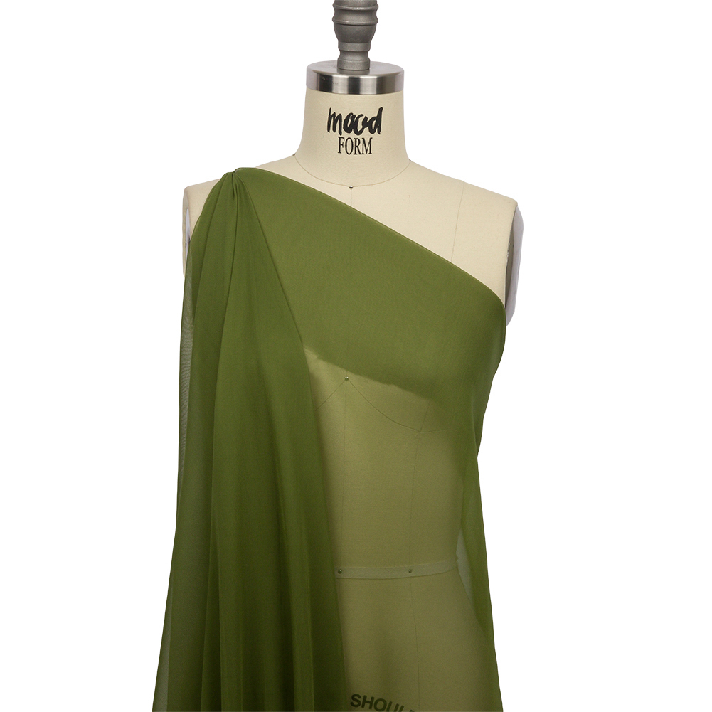 Mood's Silk Chiffon 44" - Pesto Green - Premium Collection is a sheer, lightweight and ethereal fabric. An excellent choice for fluid, top-weight garments, overlays, flowing scarves, and sheer insets such as ruffle details and draped extensions. Available in 95+ attractive shades. Note: Dye lots are subject to change up to 10% in either direction. Ordering swatches is HIGHLY recommended for these products.