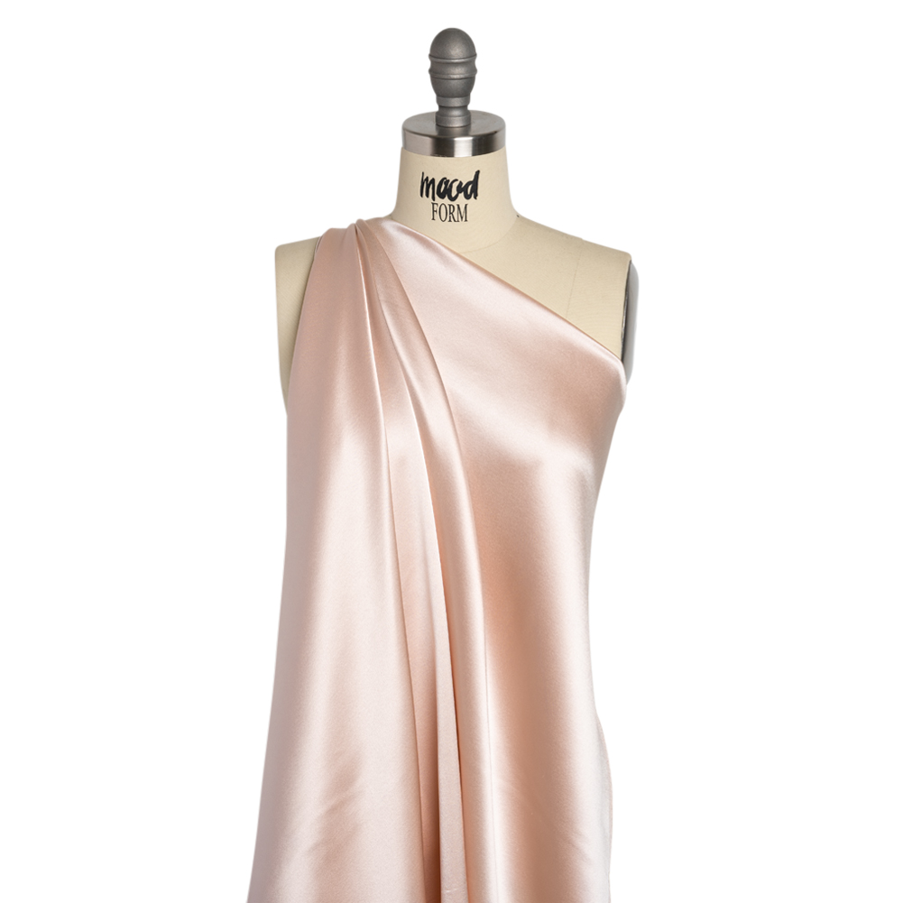 Mood’s Silk Crepe Back Satin – Cradle Pink – Premium Collection is a medium weight silk with a satin face and a creped weave on the reverse face.