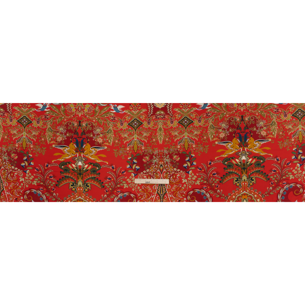 Silk Poplin Print Made in Italy - Red, Green and Golden Yellow Flowers and Crests - Deadstock