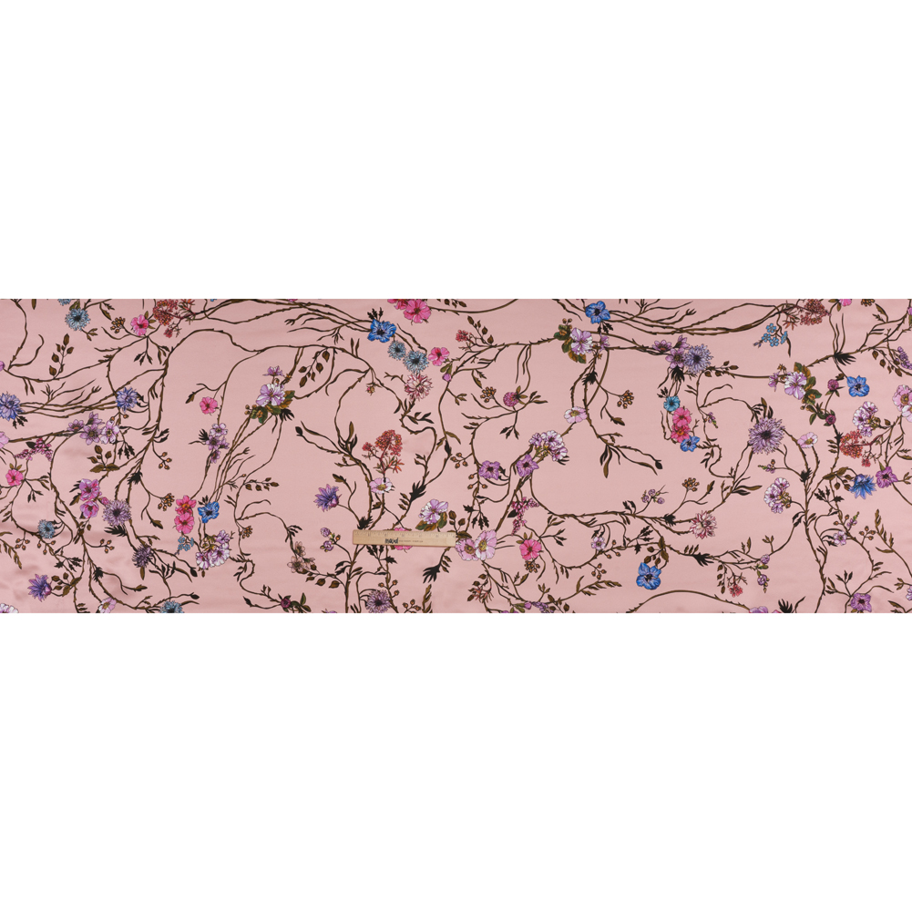 Branch out into softer territory with this Baby Pink, Purple, and Brown Flowering Branches Silk Satin Print where delicate buds bring quiet drama to every stitch.Suggested Projects: Blouses, Skirts, Lingerie, DressesContent: 100&#37 SilkStretch: NoneOpacity: Semi-Translucent Budding blossoms in shades of pink, violet, and blue flourish along slender olive-brown stems, delicately layered and scattered across a silky baby pink background. With its smooth, cool hand and fluid drape, this Italian-made semi-translucent satin is an exquisite choice for slinky dresses, elegant lingerie, flowing skirts, or romantic blouses. Depending on your project, a light lining may be preferred to enhance coverage.