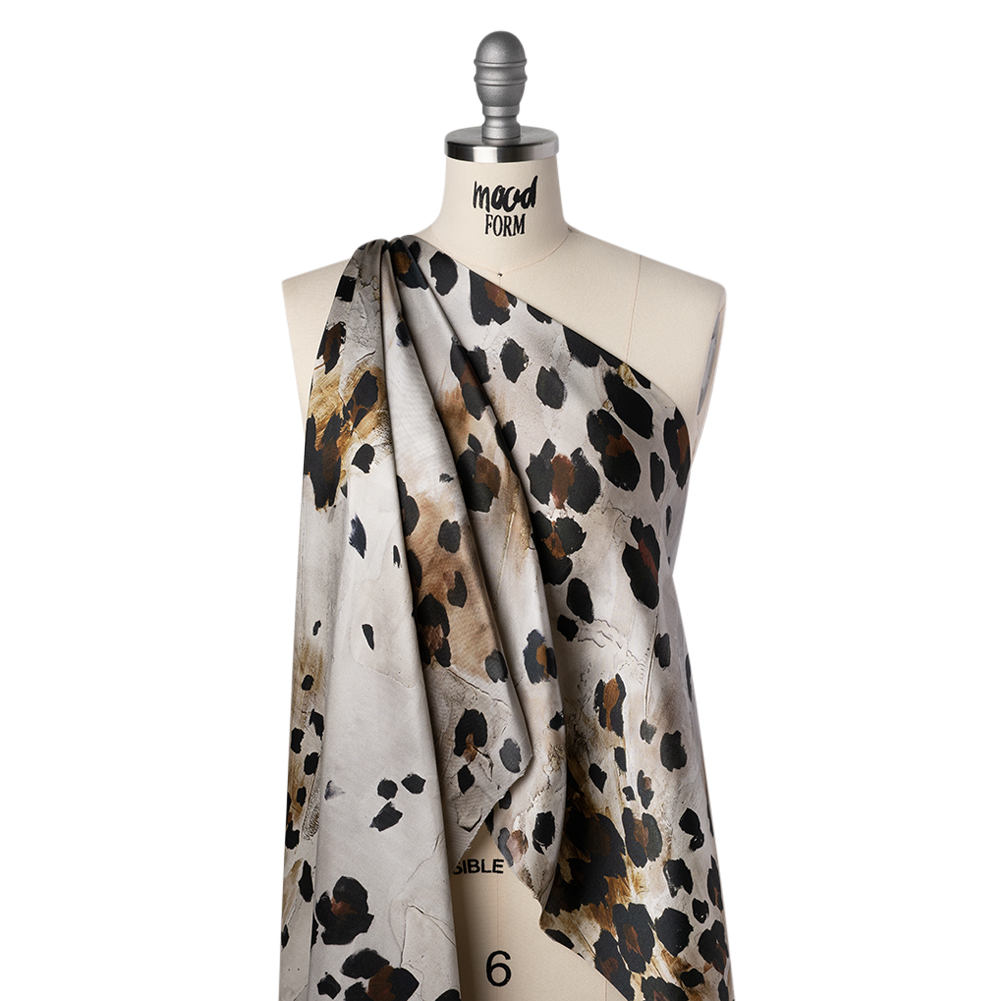 Stay neutral—but never boring—with this Brown, Beige, and Gray Painted Animal Spots Silk Twill Print, a polished silk with an artful edge and timeless versatility. Suggested Projects: Dresses, Skirts, Blouses, Lingerie Content: 100% Silk Stretch: NoneOpacity: Mostly Opaque This refined silk twill showcases broad brushstrokes and painterly splotches in soft neutrals layered across a warm gray ground, with loosely scattered leopard spots bringing playful energy. With its smooth, cool surface and gentle structure, the Italian-made fabric holds shape beautifully in elegant dresses, breezy blouses, or bold skirts. Mostly opaque and easy to handle, it lends itself well to both crisp tailoring and fluid silhouettes.