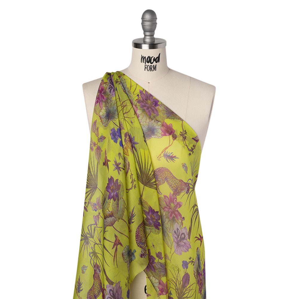 Unleash your wild side with this Tropical Flora and Fauna Silk Voile Print, where fierce fashion meets jungle fantasy with a crisp hand and fluid drape. Suggested Projects: Blouses, Dresses, Shirts, Skirts Content: 100% Silk Stretch: None Opacity: Translucent Set against a bold chartreuse green backdrop, this sheer silk Italian-made voile features pink and purple blossoms, leafy foliage, and a parade of tropical birds perched amid branches—while prowling cheetahs add a splash of wild drama. Light as air with a crisp yet delicate hand, the fabric falls in an elegant, fluid drape perfect for airy dresses, breezy tops, and flowing skirts. Its translucent quality makes it ideal for layered looks or pairing with light linings for added versatility.