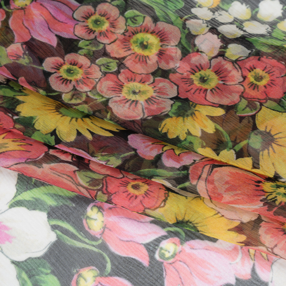 Let your wardrobe grow wild with this Pink, Yellow, and Green Flower Garden Silk Voile Print, a breezy beauty that brings delicate drape and airy comfort to every floral-forward design.Suggested Projects: Blouses, Skirts, Lingerie, DressesContent: 100% SilkStretch: NoneOpacity: Translucent Against a deep black backdrop, soft pinks, warm yellows, and snowy whites bloom in layered harmony, accented by wispy green leaves and sprigs of foliage that trail throughout the design. Lightweight and semi-sheer with a smooth hand and gentle drape, this Italian-made silk voile is ideal for floaty blouses, romantic dresses, softly gathered skirts, or delicate lingerie. Due to its translucent quality, consider lining or layering when more coverage is desired.