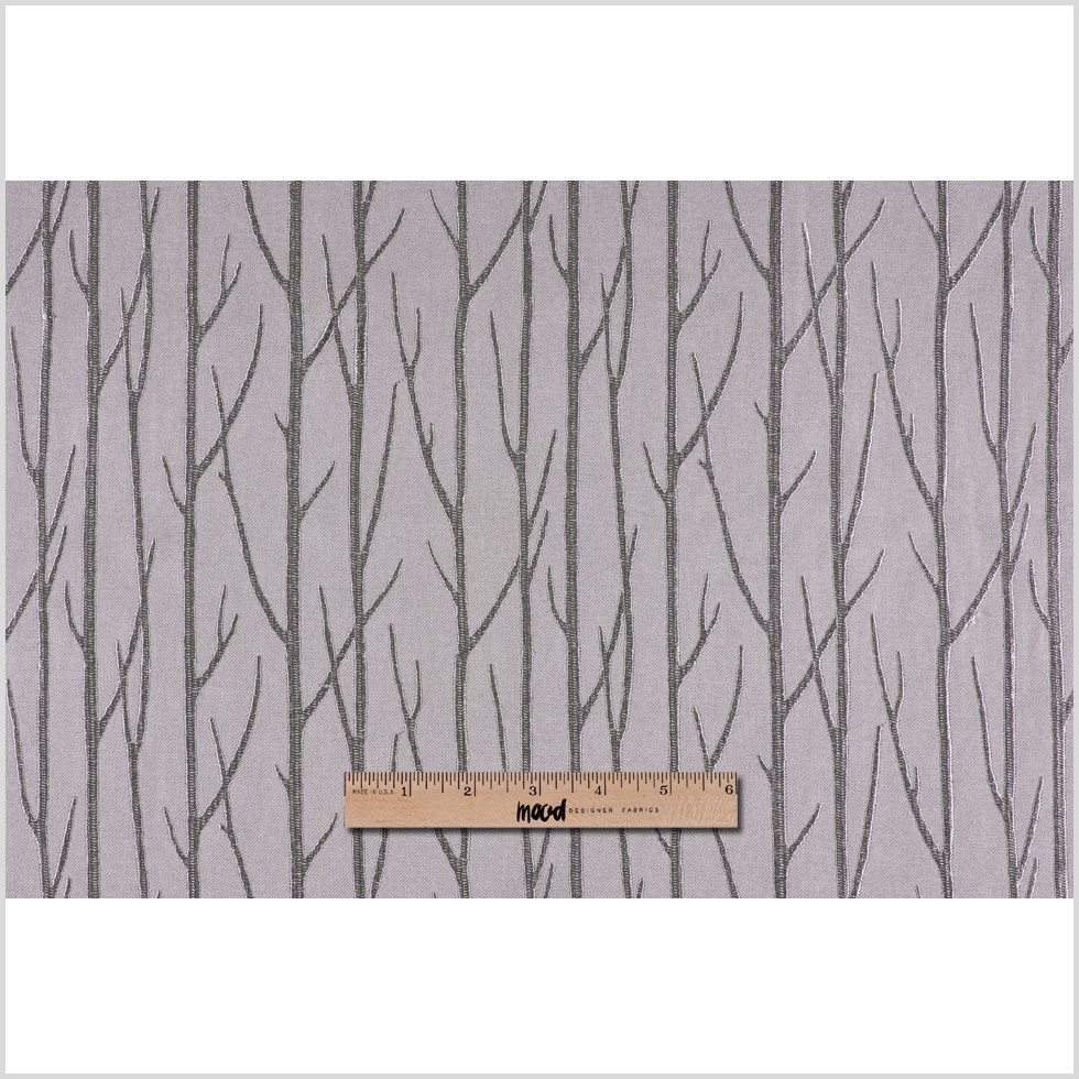 An elegant fabric if there ever was one! Tone-on-tone trees embroidered in a satin stitch on a poly fabric that looks and feels like a lightweight, menswear wool. A sophisticated home fabric in silver (pale gray) that works well in contemporary rooms as curtains, pillows, light upholstery and more.