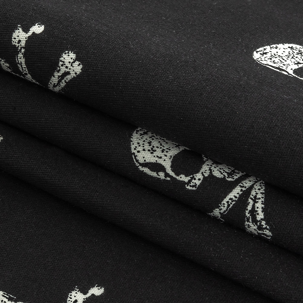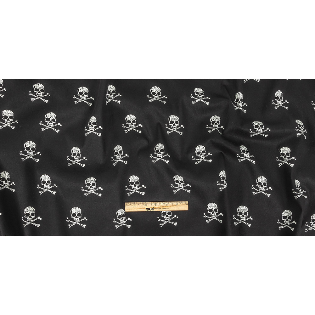 Searching for that precious booty? Our Skull and Crossbones Printed Stretch Cotton Denim is a treasure indeed.