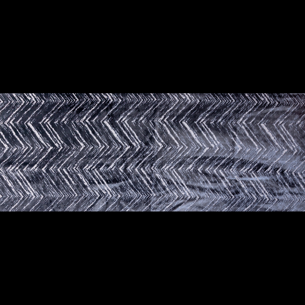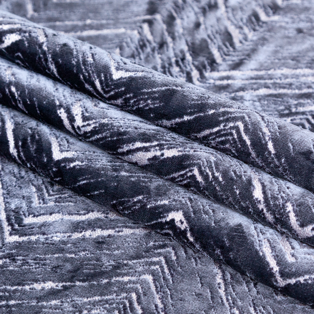 The future of home decor is here! Presenting our electric Slate Upholstery Velvet Burnout. With a luminous abstract pattern that resembles chevrons and a burnout finish that creates a striated effect throughout the design, this home fabric gives even the most couture fabrics in your home a run for their money! Thick and heavy in weight, its luxurious, velvety face, sturdy woven back, and robust drape make it an ideal medium for timeless upholstery applications with a more contemporary look. Use it to create modern ottomans, sofas, lounge chairs, and more.