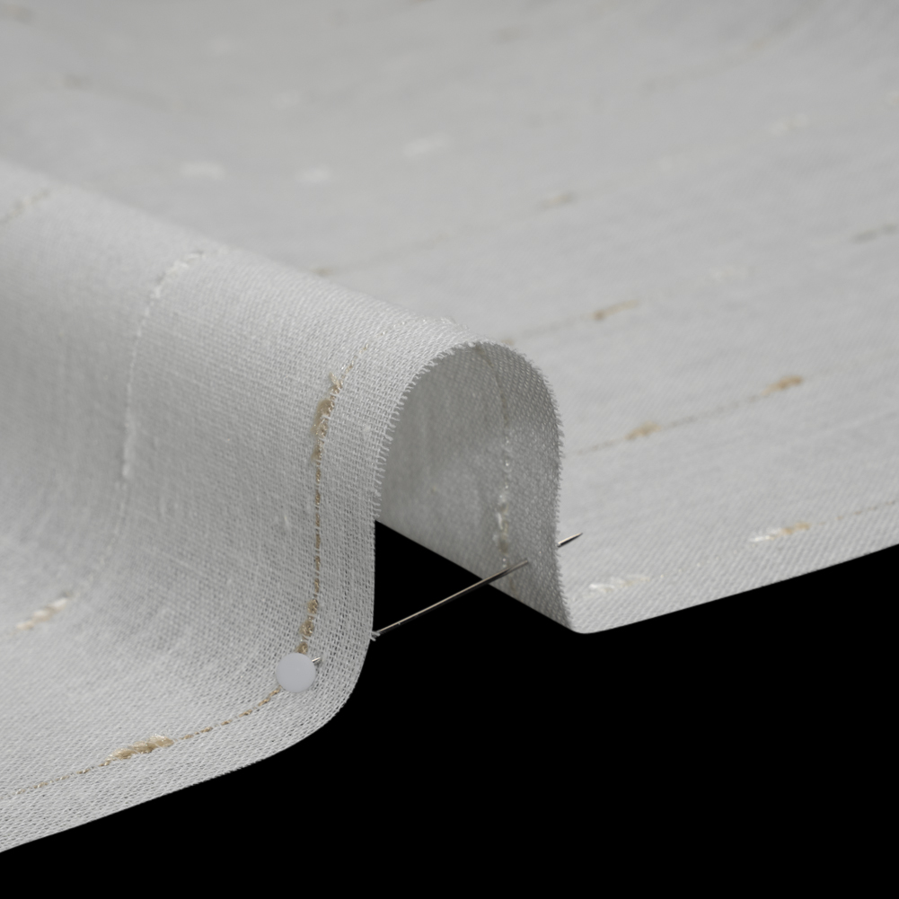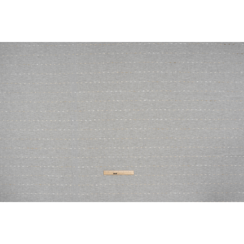 Dig your toes into the sand and ground your designs in seaside splendor with this Sand Eyelash Fringe Dotted Stripes Slubbed Double-Wide Drapery Sheers Fabric—featuring a tactile hand, alluring open weave, and airy drape.Suggested Projects: Drapery SheersContent: 52% Polyester, 48% CottonStretch: NoneOpacity: SheerSandy beige threads trace dotted stripes across a warm white ground, punctuated at intervals with delicate eyelash-fringe accents atop this drapery sheer. The finishing touches make all the difference, and this simple yet striking textile elevates your designs from DIY to high-end. Ideal for adding dimension to curtains and valances, softening window treatments, or tackling large drapery projects, its double-wide measurements ensure every detail is perfect. With a rustic, open weave forming a gridded, net-like structure and subtle slubs for texture, it’s perfect for creating spaces that feel grounded, warm, and effortlessly stylish.