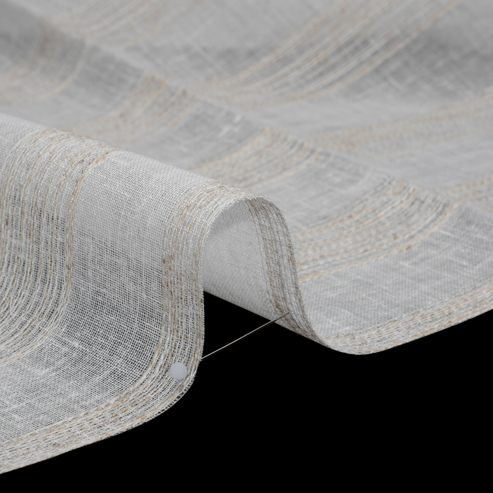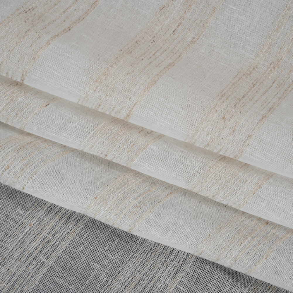 Coastal-inspired creations breeze into your home atop this Sand Textured Stripes Slubbed Double-Wide Drapery Sheers Fabric—featuring a tactile hand, alluring open weave, and airy drape.Suggested Projects: Drapery SheersContent: 76% Polyester, 13% Cotton, 11% LinenStretch: NoneOpacity: SheerSandy beige threads weave their way across a crisp white ground, forming bold, textured stripes across this drapery sheer. The finishing touches make all the difference, and this simple yet striking textile elevates your designs from DIY to high-end. Ideal for adding dimension to curtains and valances, softening window treatments, or tackling large drapery projects, its double-wide measurements ensure every detail is perfect. With a rustic, open weave forming a gridded, net-like structure and subtle slubs for texture, it’s perfect for creating spaces that feel grounded, warm, and effortlessly stylish.