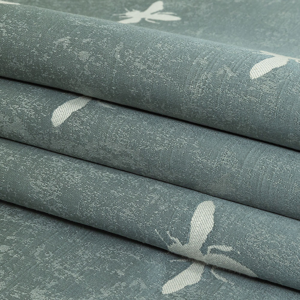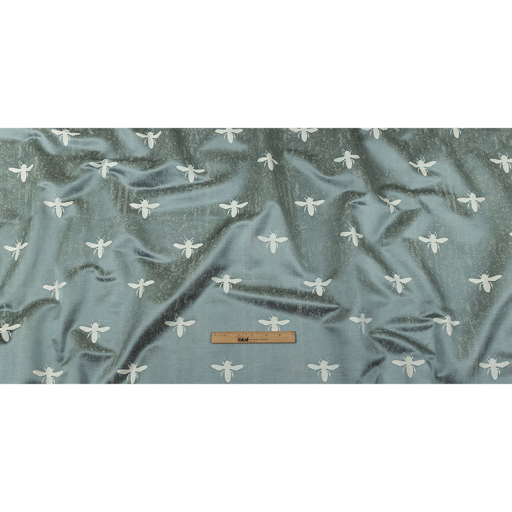 Your home will bee the best on the block with our British Imported Ocean Buzzing Bees Slubbed Drapery Jacquard! Busy oyster white bees fly amongst a metallic pale teal ground. Each bee features a woven texture, contrasting the smooth, supple ground. Fashion sumptuous statement drapes in living rooms, bedrooms, and studies. Slightly translucent, a lining may be desired for full opacity.Please note: While this fabric is 55” wide, only 54” is useable due to the selvedge edge.