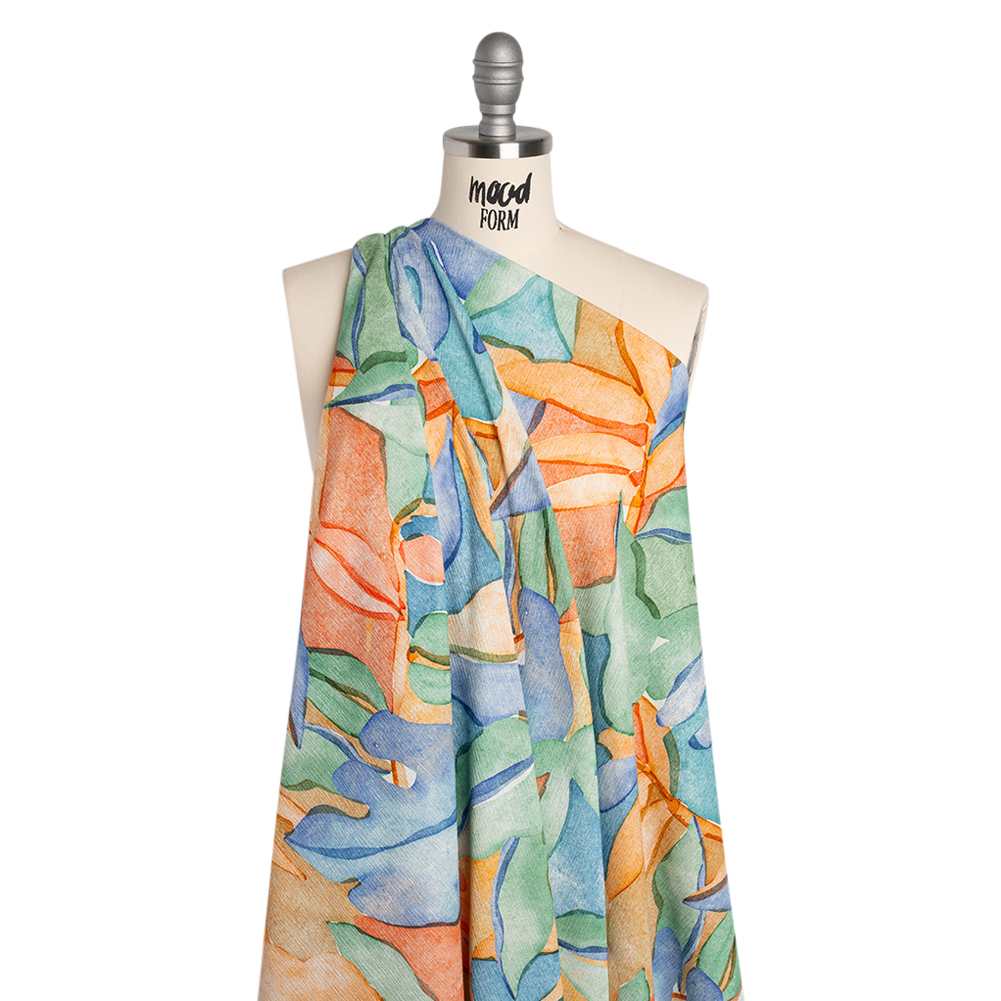Let the sun peek through our Mood Exclusive Cascading Canopy Slubbed Gauzy Cotton Woven—featuring a dry, tactile hand and supple drape.Suggested Projects: Button-Up Shirts, Dresses, Skirts, PantsContent: 100% CottonStretch: NoneOpacity: TranslucentPainted in flowing watercolor hues of green, blue, orange, and red, leaves drift and overlap atop this woven, forming a cascading canopy of lush foliage. Composed of 100% cotton, the face yields a dry hand and tactile slubs, adding dimension and visual intrigue to your casual garments. With a lightweight feel and a supple drape, this breathable fabric is perfect for keeping you cool in the heat, lending itself to sundresses, breezy button-ups, wide-legged pants, tiered maxi-skirts, and more. Translucent, a lining may be desired for added opacity.