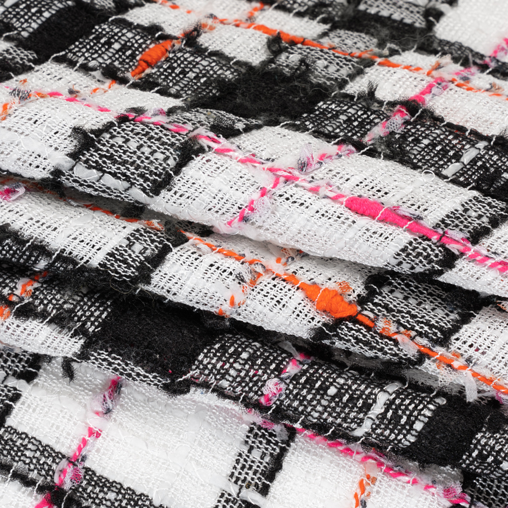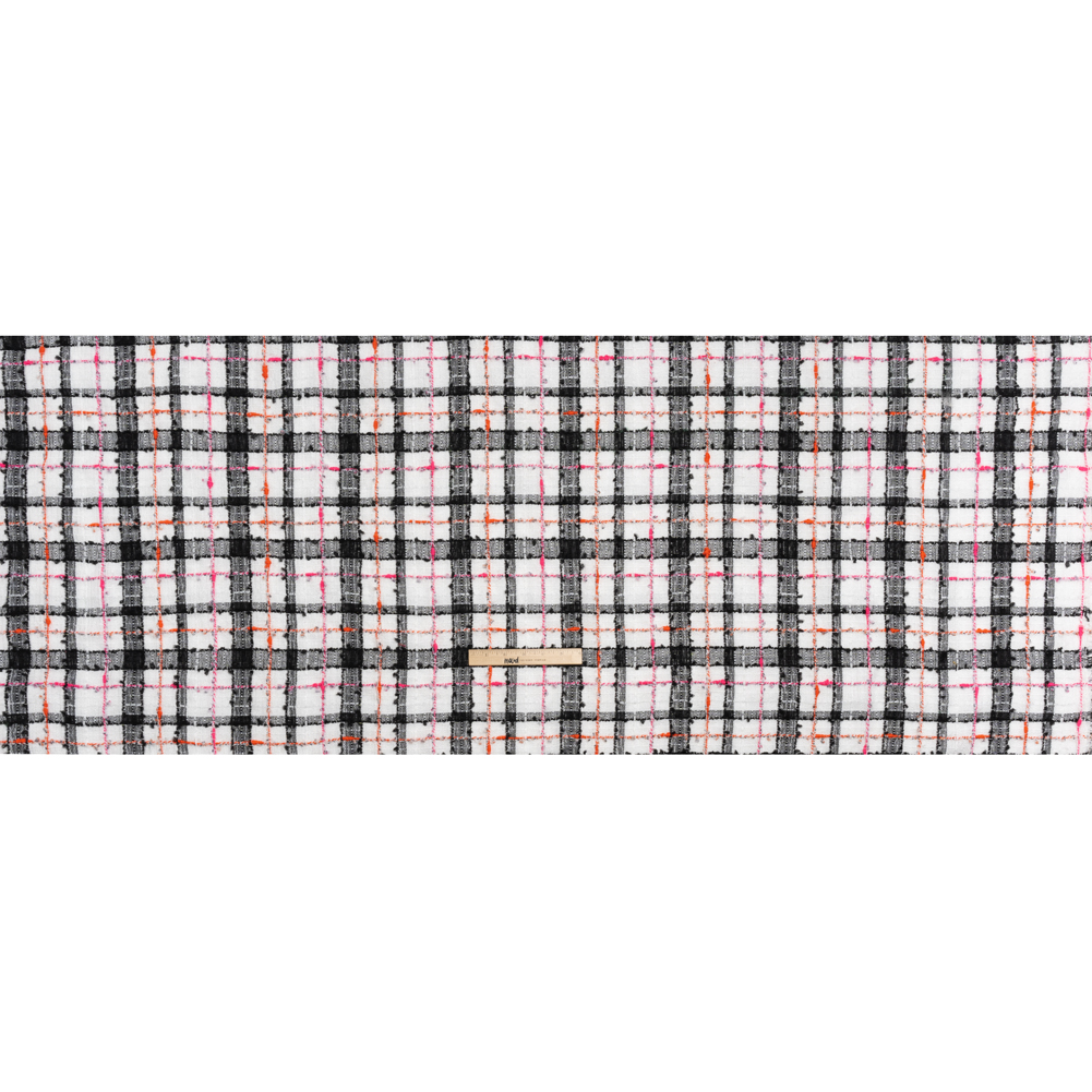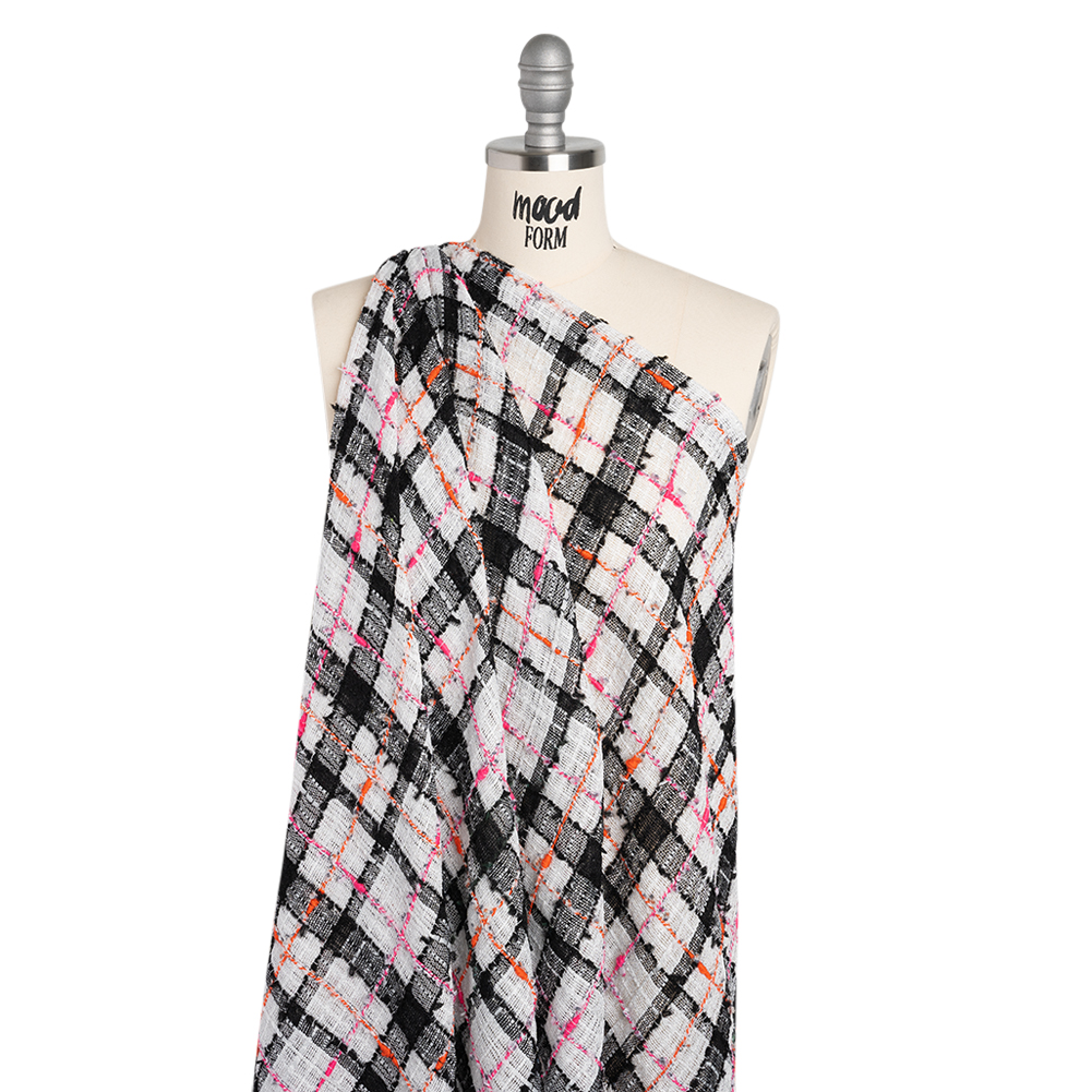 Wrap this Plaid Slubbed Gauzy Polyester Woven around your next project—featuring a tactile hand and malleable drape.Suggested Projects: Blazers, Skirts, Dresses, OverallsContent: PolyesterStretch: NoneOpacity: TransparentFor the autumn vibes in any weather, reach for this black, white, and pink plaid woven. Lightweight and with a slubbed, gauzy hand, it’s perfect for warmer weather looks—or layered with a lining for chillier locales. With a malleable drape, sew up some chic suit sets, breezy overalls and dresses, wrap skirts, and more. Transparent, we suggest using a lining for increased opacity, structure, and comfort.